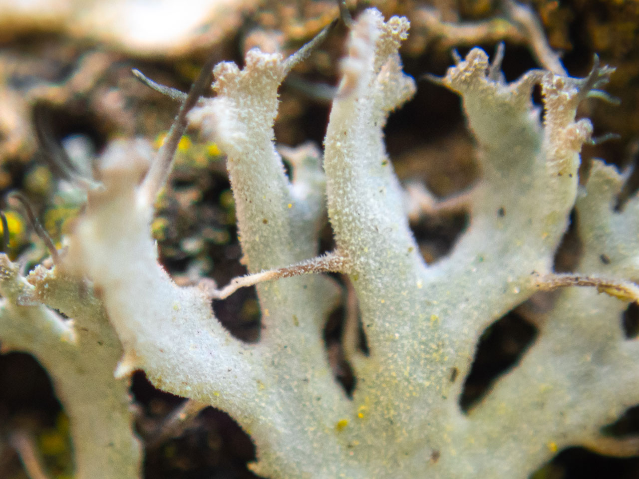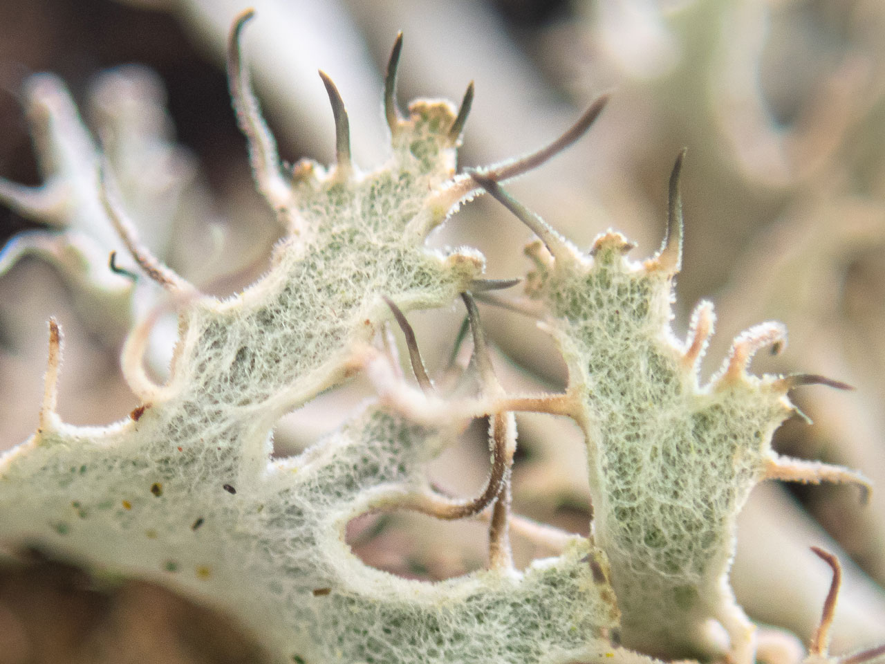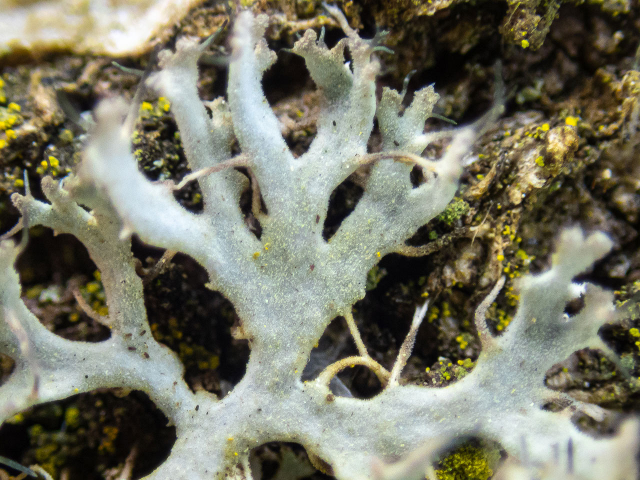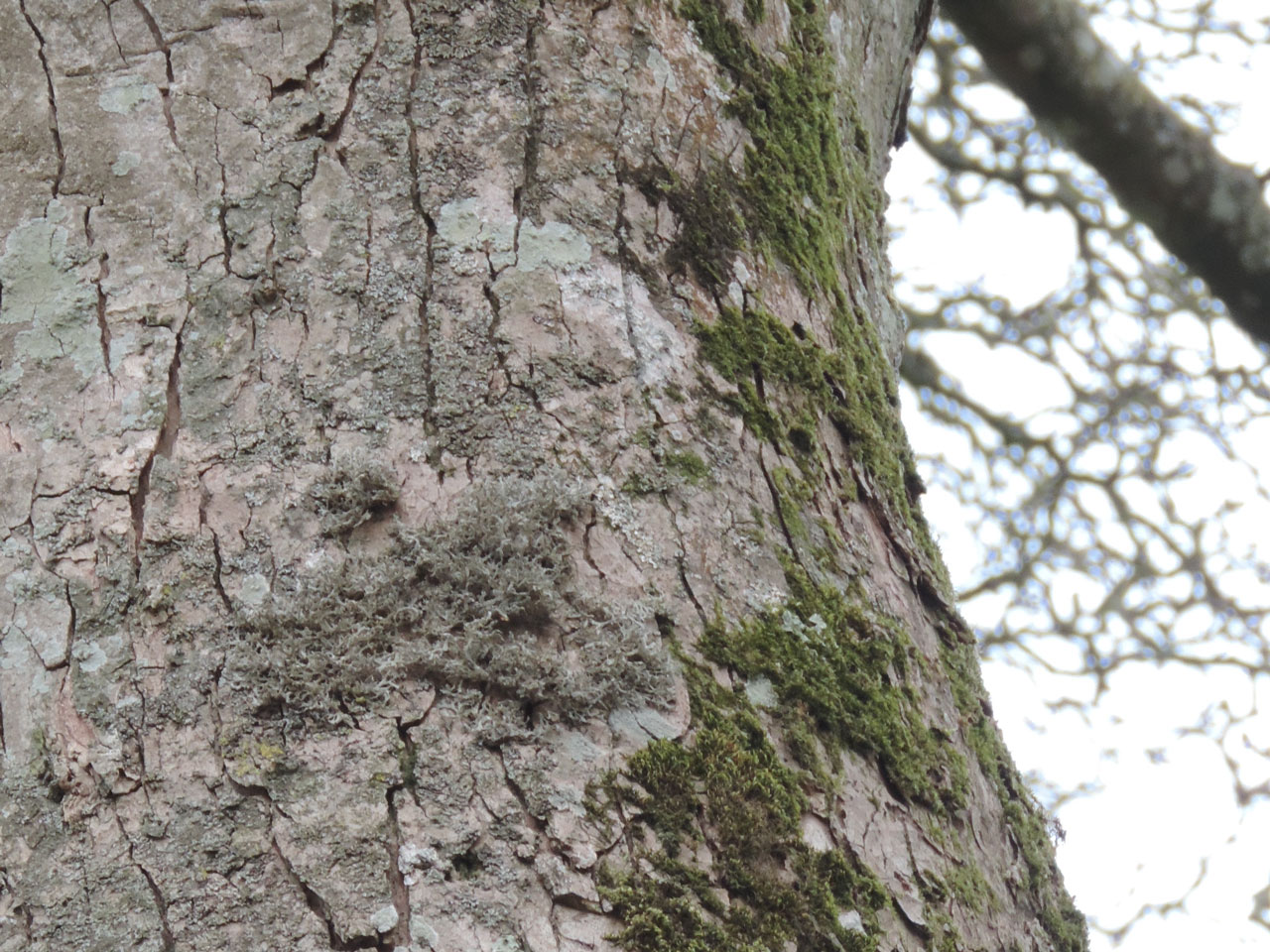 A rapidly declining large foliose lichen found on well-lit and moderately nutrient enriched tree trunks, often high up on the trunk. Declines due to past acidifying pollution and losses of Elm trees to disease but continuing from high levels of ammonia pollution, loss of old trees along with future threats from Ash Dieback. Scattered occurrences on limestone rock surviving better. The thallus is grey with long, much branched, narrow lobes which widen and become brown at their tips. The upper surface has a "furry" or velvety appearance whilst the lower is white and lacks a lower cortex (the hyphae form a loose mat). Cilia on the margins of the lobes are often pale and curved, giving the lobe tip the appearance of eagle's claws. Apothecia are common in unpolluted areas, with black, frequently pruinose discs and borne on short stalks.