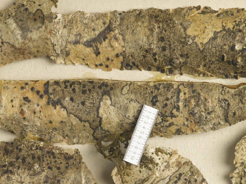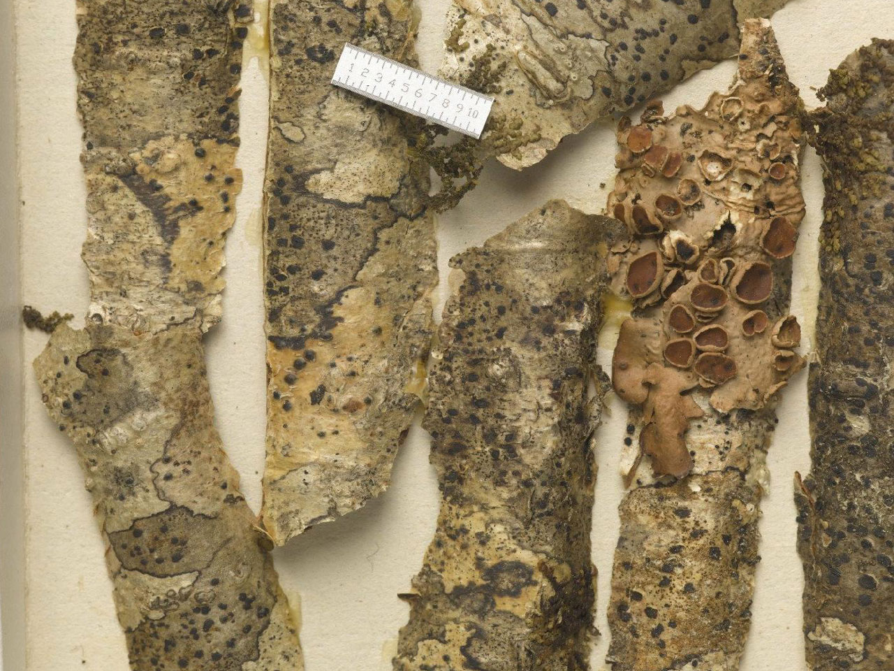 A rare lichenicolous fungus of a rare lichen, Arthothelium macounii, which is itself confined Hazel stands in temperate rainforests, and so far only known from two sites, one not recorded recently. Can be spotted as fleck-like, brown-black, not pruinose, rounded apothecia on the thallus of the host.