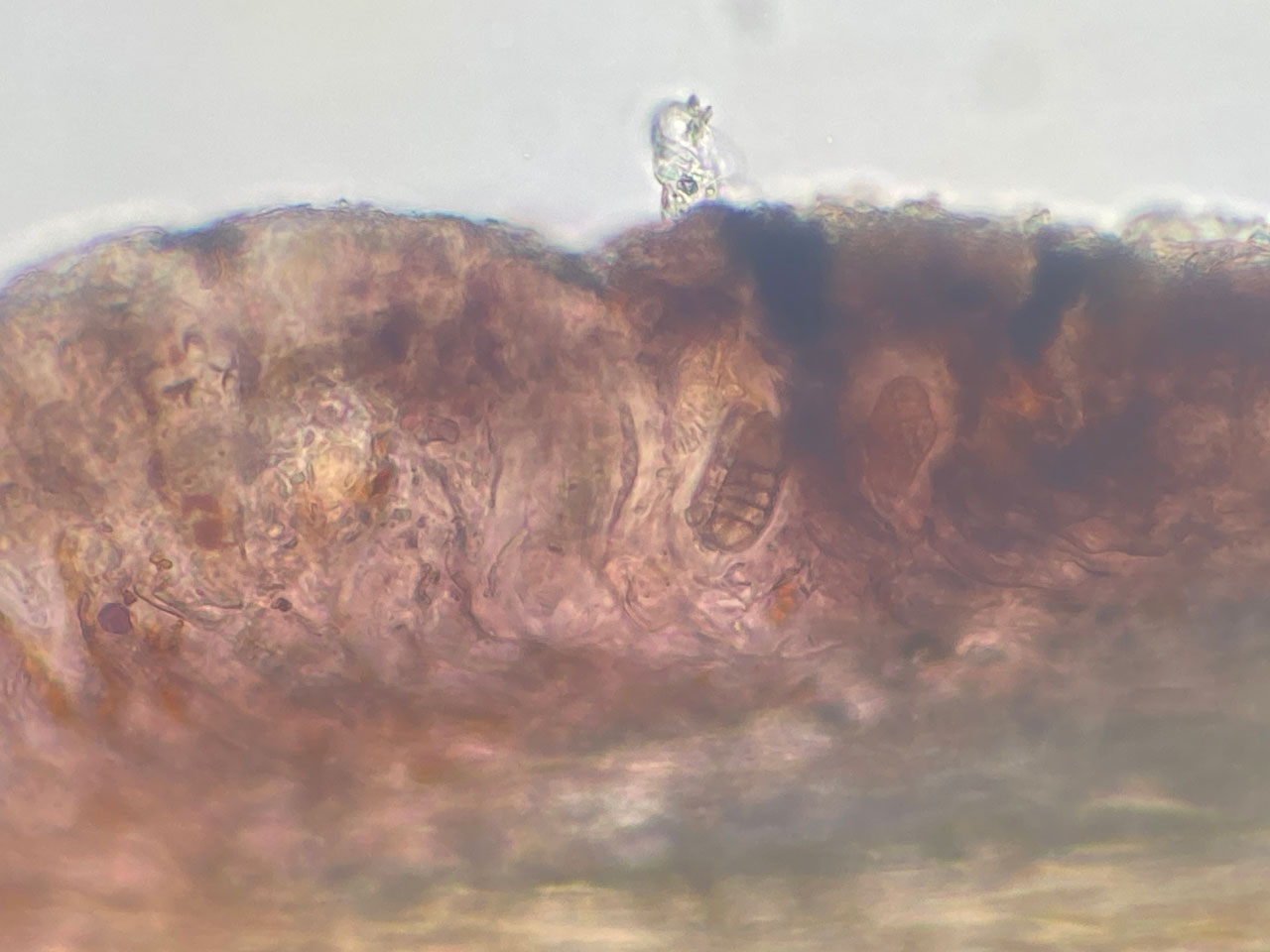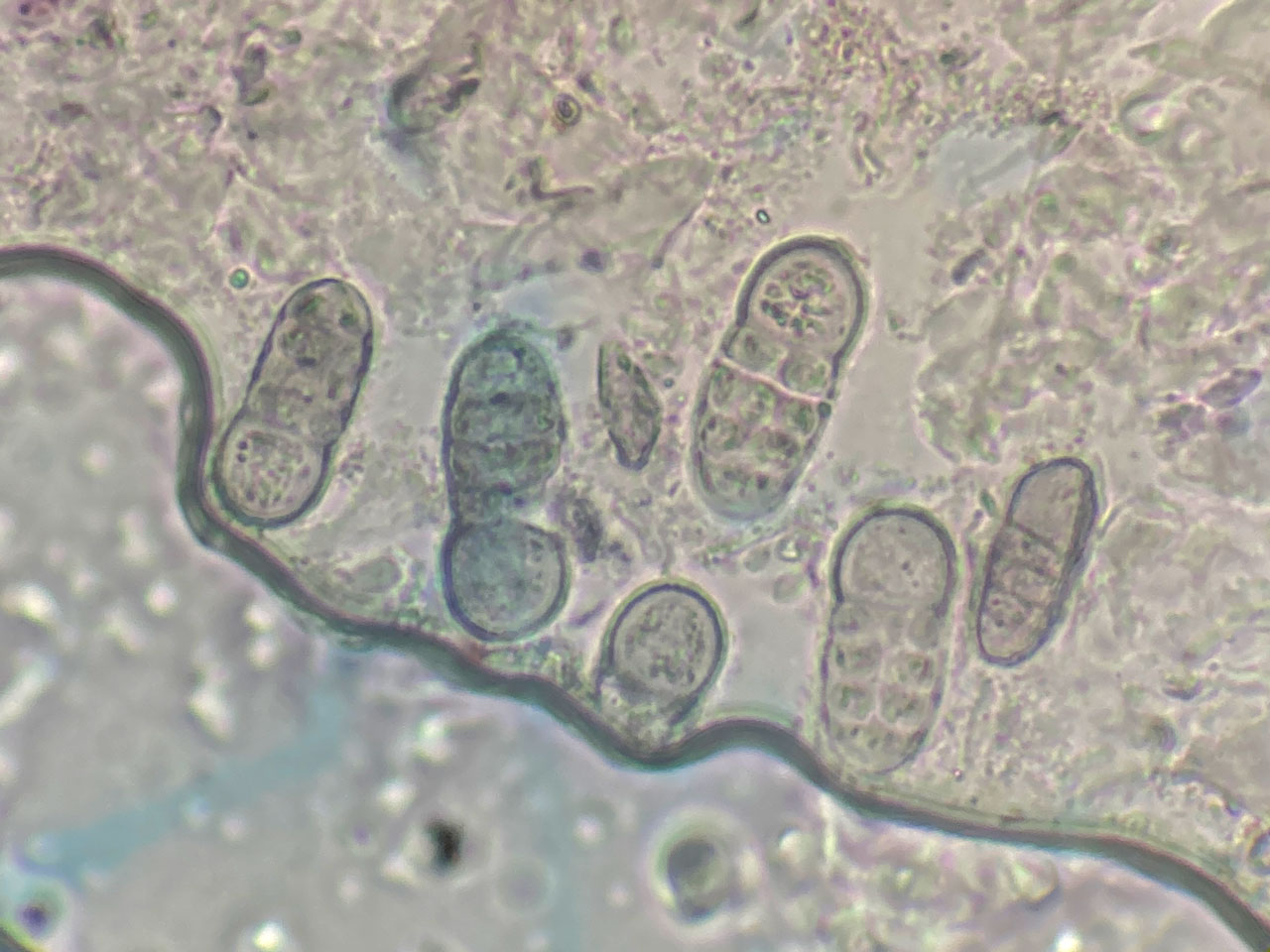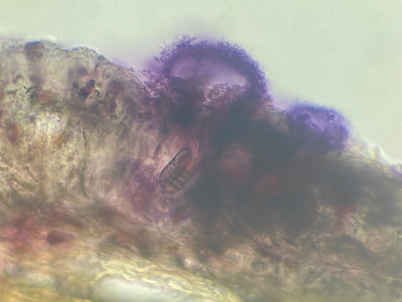 A special and rare species of the best Atlantic Hazel woods with large Arthonia type apothecia with a brownish purple tinge on a brown-grey to fawn thallus. Spores large with with a undivided enlarged apical cell and apothecial sections K+ purple-violet or magenta, see the similar A. dictyosporum.