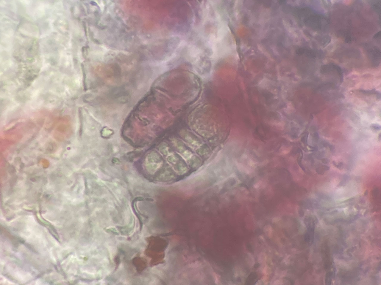Like A. dictyosporum, but apothecia with a brownish purple tinge; thallus around the apothecia often reddish orange; epithecium purplish, K+ purple-violet; epithecium, hymenium and hypothecium with orange-red oily inclusions that are K+ magenta. Ascospores 20–38 × 10–14 µm, with a undivided enlarged apical cell and the lower part with 4–6 transverse septa and at maturity most transverse cells with 1 or 2 longitudinal septa, when old brown and distinctly warted.