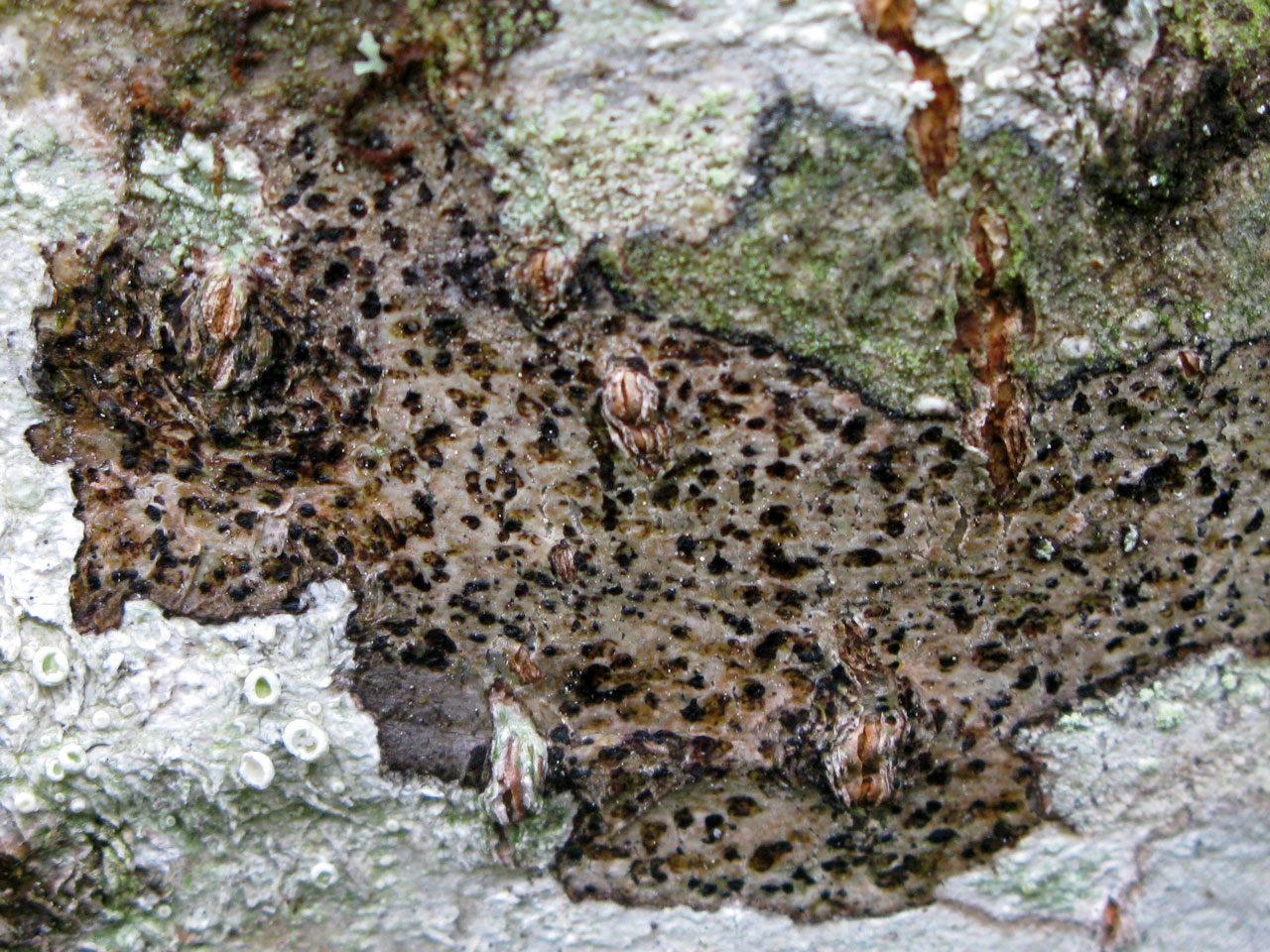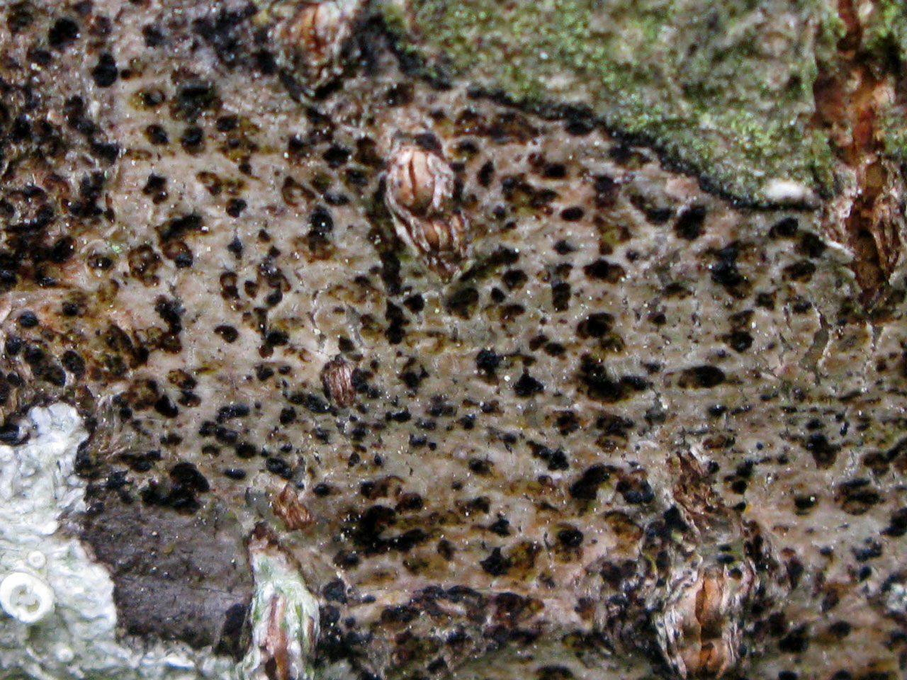 Thallus immersed, white or greenish grey, usually forming small (<3 cm diam.) patches; photobiont trentepohlioid. Apothecia 0.3–0.6 mm diam., ± rounded, slightly convex, black, not pruinose, in section 90–130 µm tall; epithecium reddish brown, K+ greenish; hymenium 70–100 µm tall, colourless or pale straw, K+ greenish yellow; hypothecium 10–30 µm tall, colourless or patchily reddish-brown (K+ greenish); paraphysoids 0.7–1.5 µm diam., numerous, pigmented and to 2.5 µm diam. in the epithecium; apices often with a dark hood or cap. Ascospores 29–36 × 12–15 µm, obovoid-ellipsoidal to obovoid-cylindrical, muriform with 7 to 8 (–9) transverse septa, at maturity most transverse cells with 2 or 3 longitudinal septa, when old brown and warted.