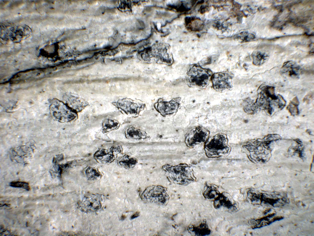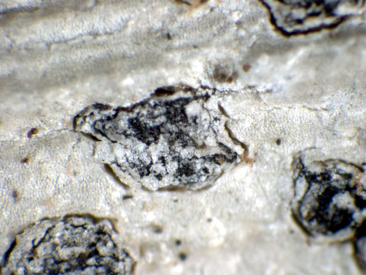 A spectacular lichen of smooth bark in old woodlands, with a cream thallus and large black apothecia with muriform spores. A few 19th century collections were made from the south west of Britain and Ireland but there have been no records since, although this is an easily spotted species. A rather mysterious species, which maybe is still be refound here.