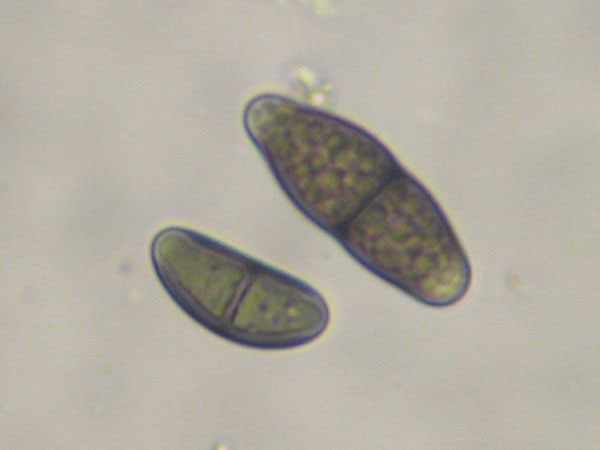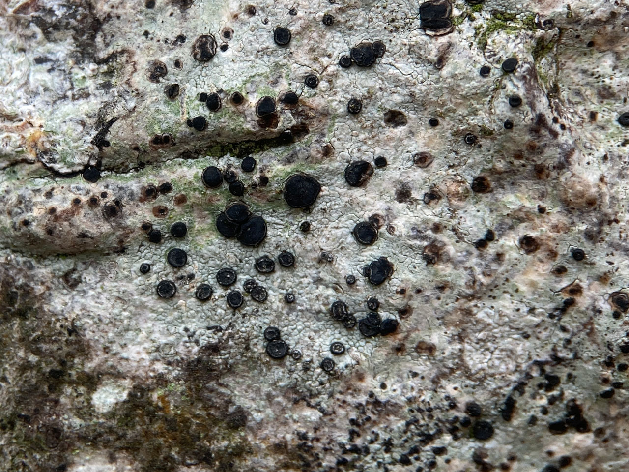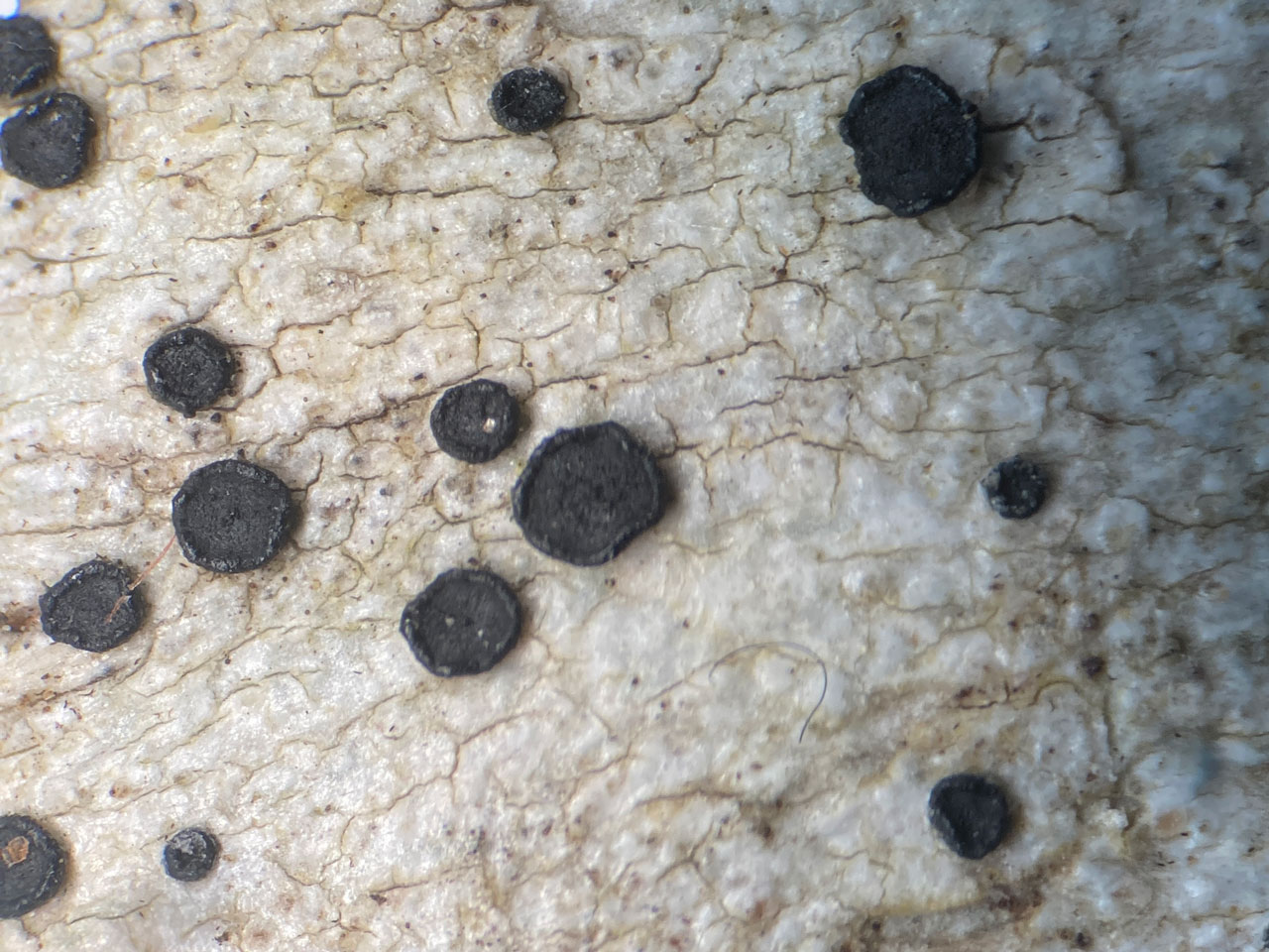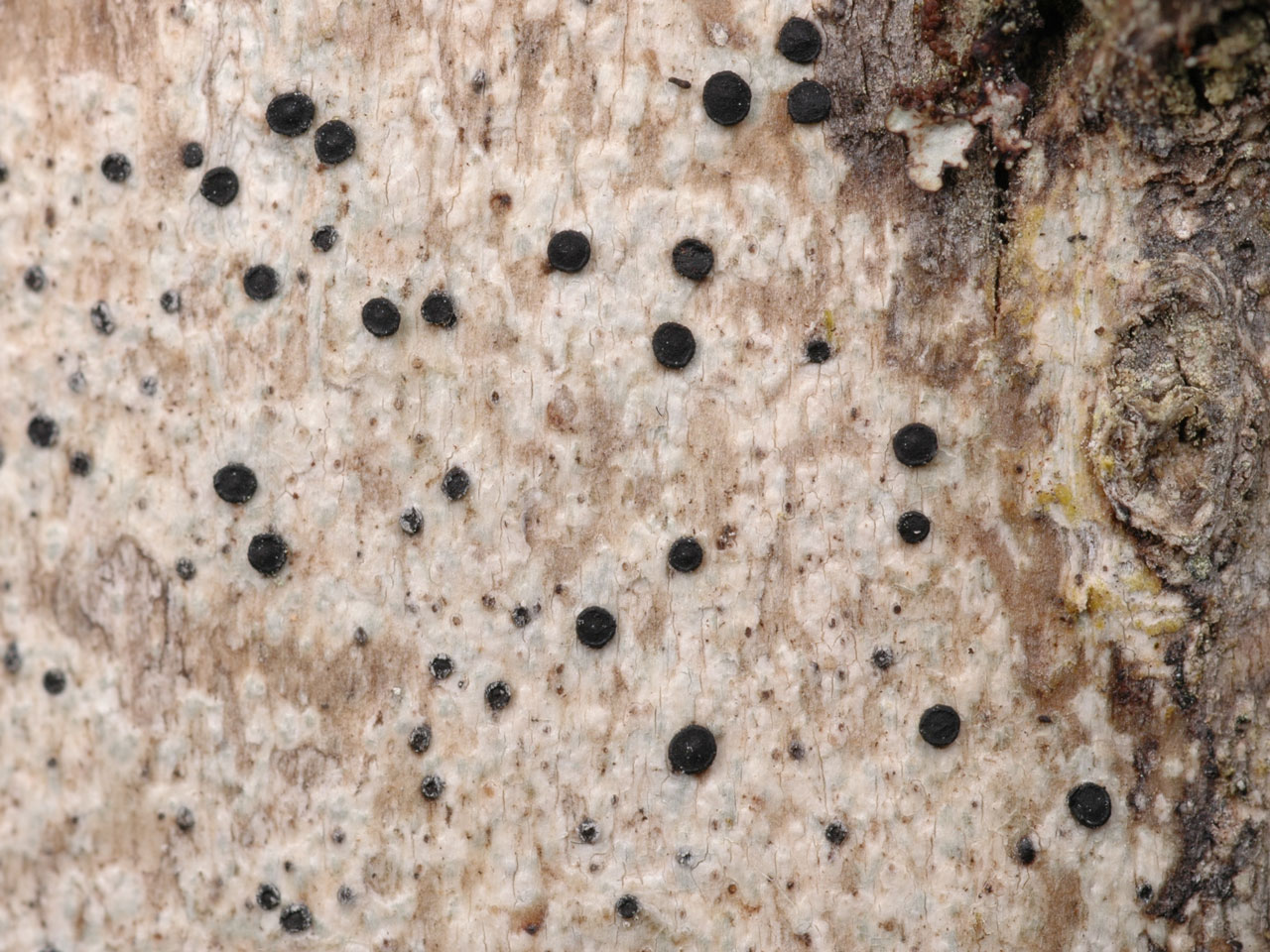 A frequent species of smooth mesic bark in N. & W. Britain and W. Ireland, marked by its white thallus with contrasting neat black apothecia, along with brown one septate spores. There are several similar rarer epiphytic Buellia species distinguished by spot tests, the presence or absence of hymenial oil droplets, and form of the spores.