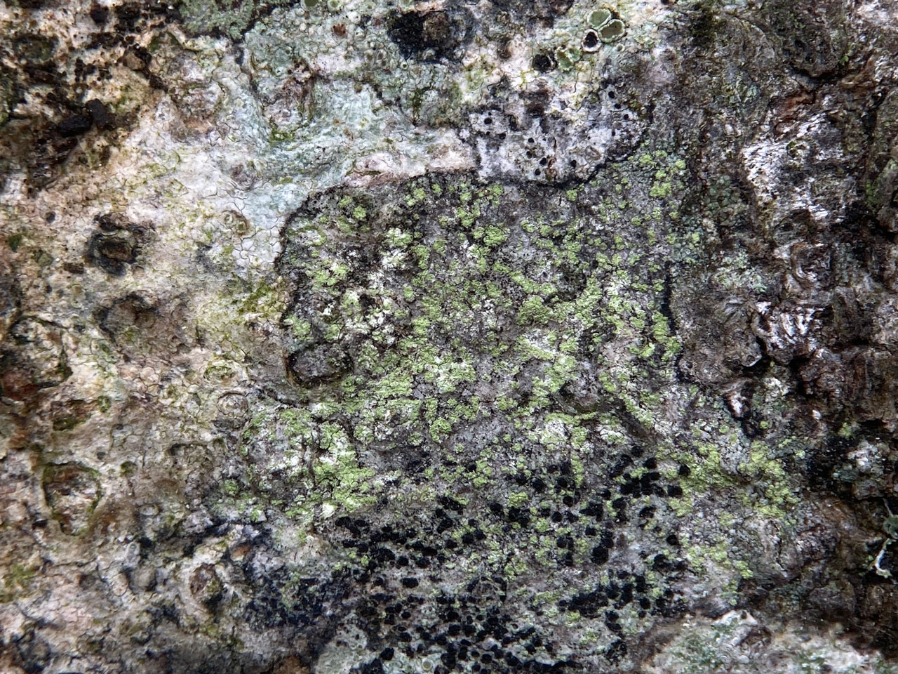 A common, usually sterile, sorediate lichen, with a grey-white to greenish grey thallus and mostly discrete soralia which are pale green-grey to ash-grey, often with a blue tinge, but pale yellow when abraded. Found on mildly acidic to neutral bark and tolerant of moderate pollution, also found on lignum and weathered worked timber and rarely on brick, usually in well-lit situations.