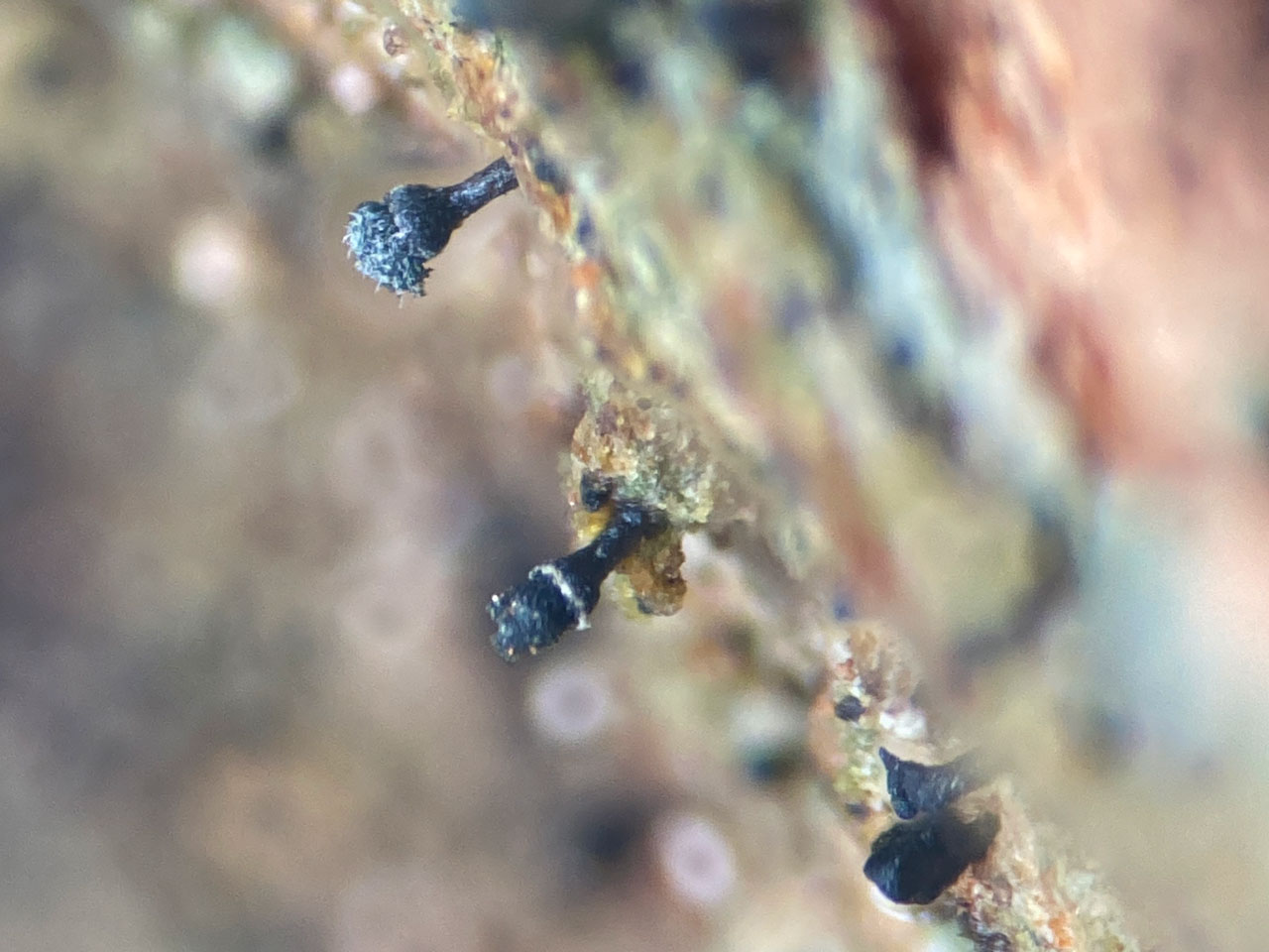 A widespread Pinhead, mainly found on lignum. Typical material has a black mazaedium (a loose spore mass, which makes sooty marks on one’s fingers if touched) on stalked apothecia with white pruina on the rim of the apothecia and an immersed thallus. The white pruina, however, can be absent, and the spores and asci need to be checked on such material. Possibly declining in the south but still frequent in the north.