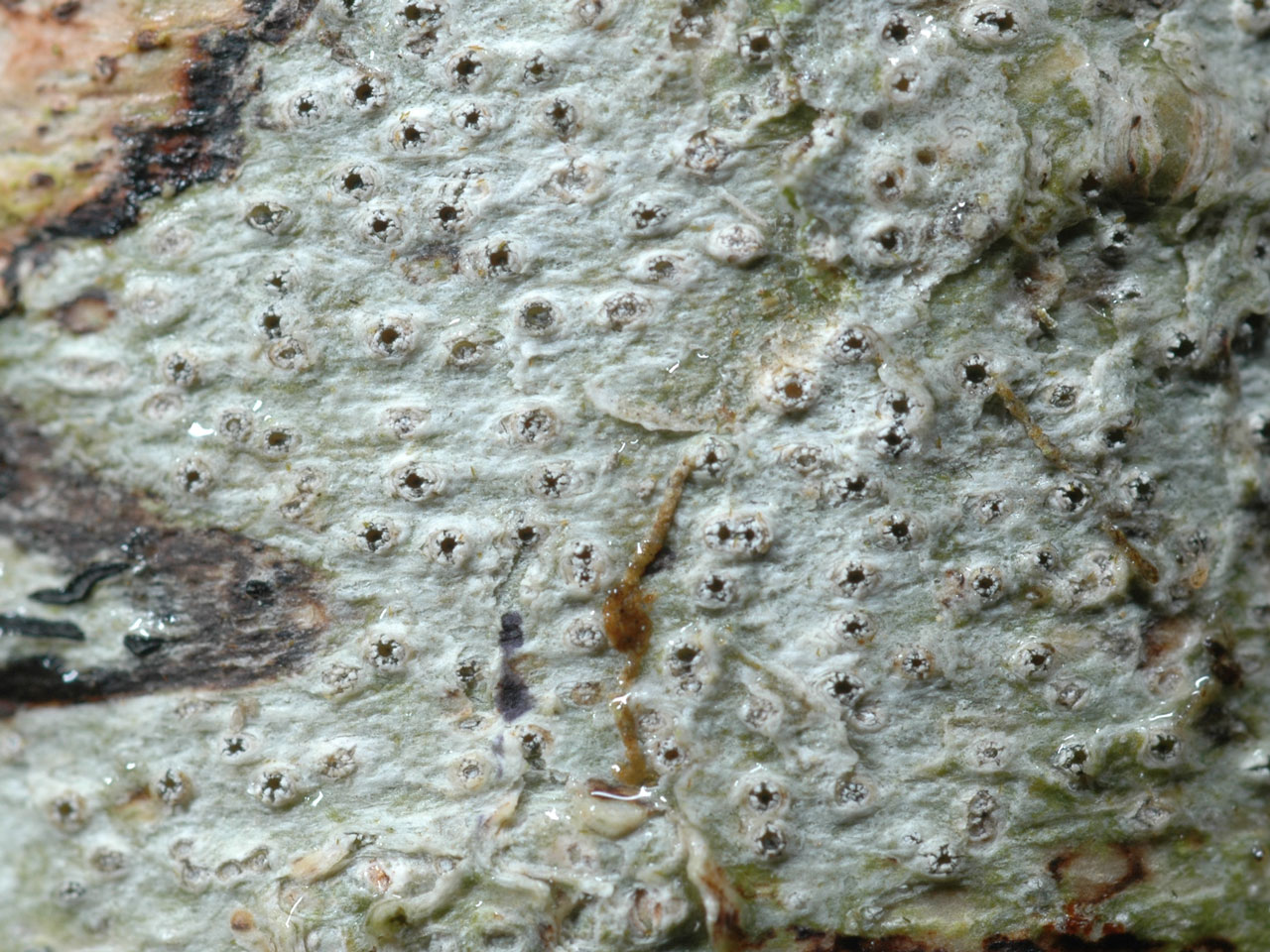 Thallus cream, white or pale ochraceous, uniformly thin, somewhat immersed, ± continuous, cortex an ill-defined superficial layer of necrotic cells mixed with sloughed bark cells interspersed with calcium oxalate crystals; prothallus absent. Soredia and isidia absent. Photobiont Trentepohlia. Apothecia 0.4– 0.7 (–0.8) mm diam., flattened, not immersed in warts, erumpent, urceolate; ostiolar opening to 0.3 mm diam.; true exciple free, white, ± radially stellate-lacerate, partly obscuring the black to ± densely grey-white pruinose apothecial disc; hymenium (90–) 100–120 (–130) µm, colourless, I–; hypothecium colourless; epithecium colourless to pale brown, encrusted with numerous small irregular crystals. Hamathecium of filamentous unbranched, rarely septate paraphyses; periphysoids lining the upper inner surface of the true exciple. Asci subcylindrical, with a single functional wall layer, abruptly thickened at the apex, sometimes with a minute internal apical beak, K/I–, (4-) 6- to 8-spored. Ascospores (30–) 35–50 (–55) × (7–) 8–10 µm, cylindrical to broadly cylindric-fusiform with rounded ends, remaining colourless when mature, with (7–) 9–11 (–12) strongly thickened lateral distosepta and no longitudinal septa, I+ purplish blue, with a perispore that is constricted at the septa. Conidiomata not known. Thallus C–, K–, KC–, Pd–, UV– (no lichen products detected by TLC).