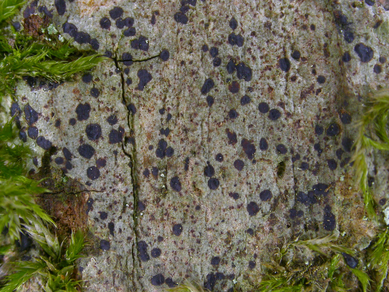 Tallus immersed, occasionally superficial, to 35 µm thick, effuse, pale to dark grey, often tinged green; hyphae K/I–. Apothecia (0.1–) 0.2–1.5 mm diam., rounded, flat to slightly convex, red-brown to brown-black, often slightly glossy, resembling spots of tar; in section 55–70 µm tall, ± uniformly orange- brown, K+ dull pale purple; epithecium indistinct; hymenium 25–35 µm tall; hypothecium 30–40 µm tall; paraphysoids 0.5–1 (–1.5) µm diam., not swollen or pigmented at the apices; apices often embedded in a thin, clear gel-like layer. Ascospores 7–11 × 3–4 µm, 1-septate, obovoid or slipper-shaped, colourless. Pycnidia frequent, 80–100 µm diam., brown, the wall orange- to red-brown, K+ pale purple; conidia 3–4.5 × 0.5–1 µm, bacilliform to narrowly ellipsoidal, straight or slightly curved. Lichen products not detected by TLC.