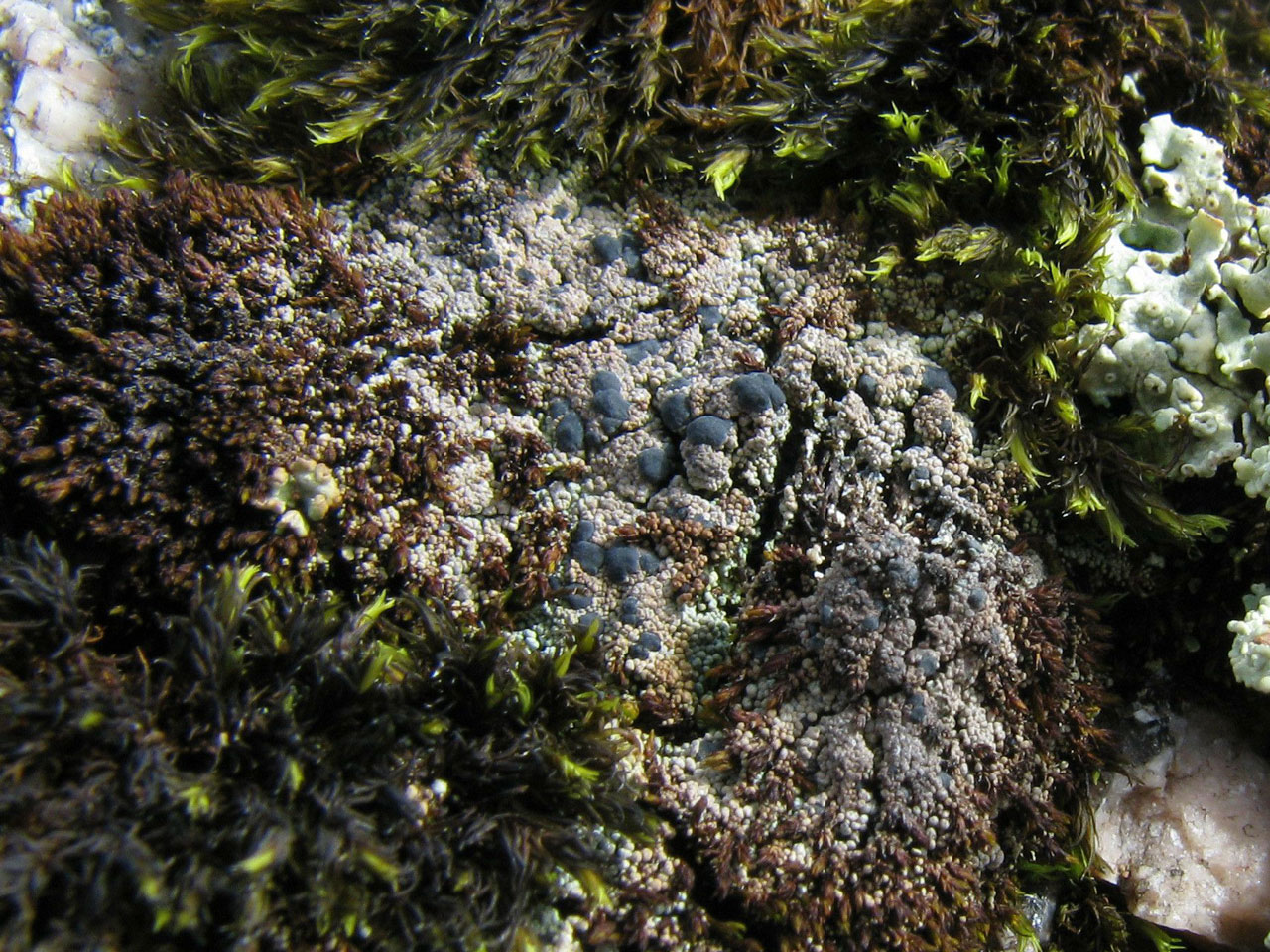 A distinctive lichen of late snow lie habitats, with a brownish thallus of dense subglobose granules which are UV+ blue-white and bluish black apothecia often with blue-grey pruina especially when wet. Mainly found in the Scottish Highlands, but with records from Northern England, North Wales and a single Irish record.