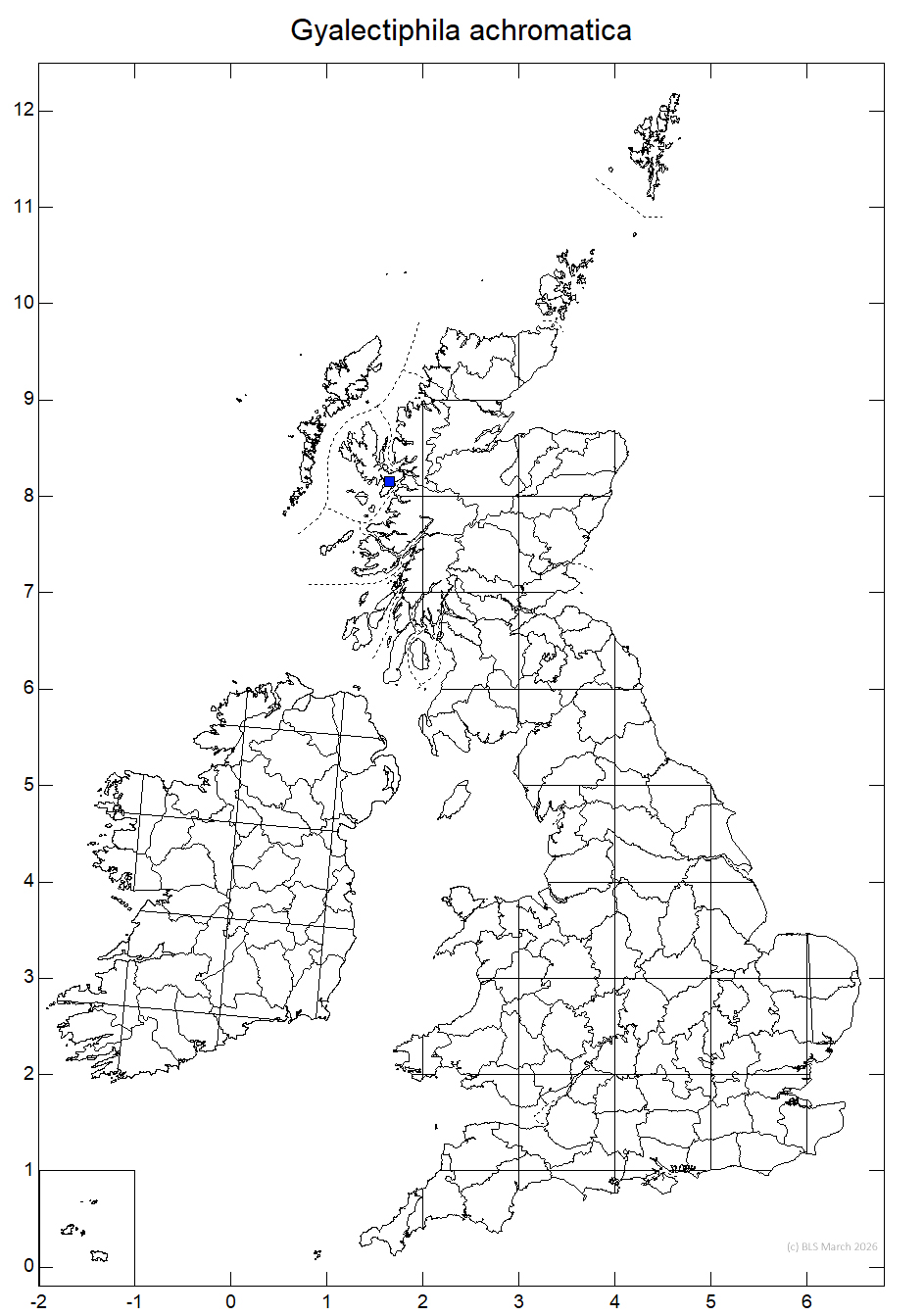 Taxon Gyalectiphila achromatica Authority (B. Sutton) Cl. Roux & Diederich (2024) Synonyms Refractohilum achromaticum Conservation Status NE NR (Key) BLS Number 2485 Distribution Map