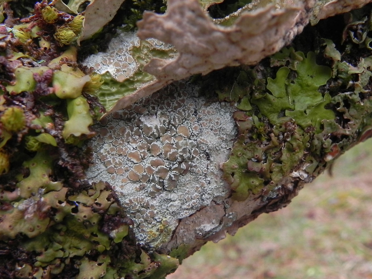 Thallus continuous or irregularly rimose, pale to medium grey, smooth to warted; prothallus absent or black. Apothecia 0.7–1.5 mm diam., immersed at first, finally sometimes sessile; thalline margin well-developed, persistent, coarsely crenate to almost dentate, flexuose with age, white or a paler grey than the thallus, medulla with very large crystals not soluble in K; disc flat to slightly convex, orange-brown or red-brown; epithecium red-brown, interspersed with coarse granules also present on the surface, ? not dissolving in K, Pd+ orange (with the formation of crystals); hymenium 60–85 µm tall; paraphyses 2–3 µm diam., sparsely branched and anastomosed, apices not or slightly swollen. Ascospores (7.5–) 10–14.5 × (6–) 7–8.5 (–9.5) µm, broadly ellipsoidal. Conidia 10–14 µm long, cylindrical. Thallus C–, K+ yellow, Pd–, UV– reflecting mauve-purple; thalline margin and epithecium Pd+ yellow-orange (atranorin, pannarin, ± placodialic acid, ± roccellic acid).