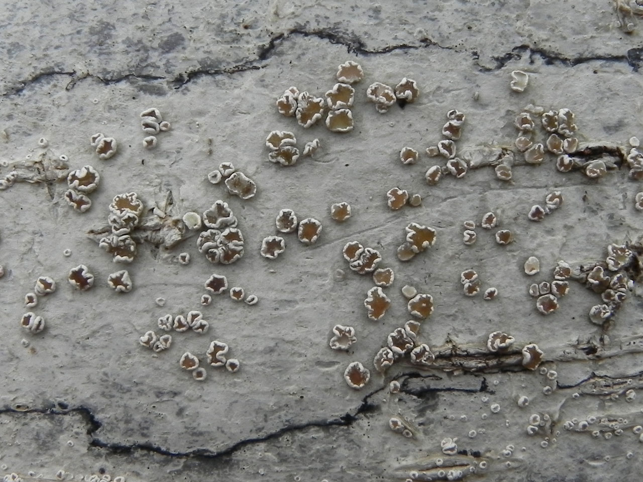 A rather lovely Lecanora with swollen and flexuose, white decorticate margins and orange-, red- or dark brown disks that are pruinose when young. A rather scarce, mainly northern species of smooth bark on deciduous trees that appears to have declined in the south.