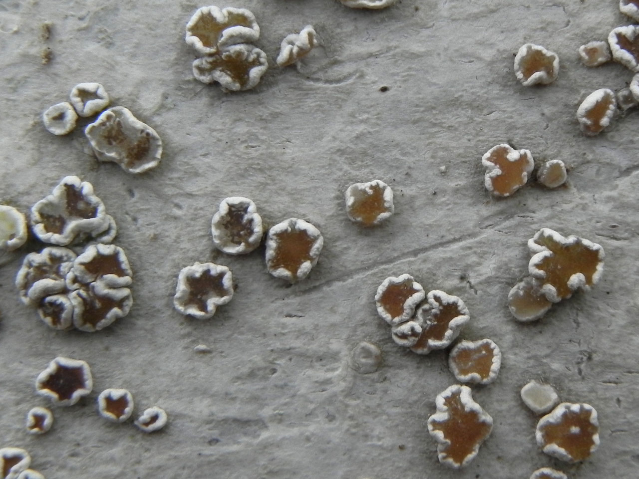 Thallus continuous, smooth or minutely cracked, only becoming areolate in old central parts of the thallus, often poorly delimited, pale grey; prothallus black or absent. Apothecia (0.8–) 1–2.5 (–3) mm diam., sessile, slightly constricted at the base, dispersed or rarely aggregated when they may be angular by compression; thalline margin well-developed, appearing swollen, persistent, entire to flexuose, raised, white-grey, often pruinose, without a differentiated cortex, with small crystals; disc variably coloured, from pale to mid brown, also orange-, red- or dark brown, pruinose when young but becoming convex and non-pruinose with age; epithecium interspersed with coarse yellow granules dissolving in K; hymenium (70–) 80–110 µm tall; paraphyses 1.5–2.5 µm diam., unbranched or sparsely branched and anastomosed, apices to 3.5 µm diam., slightly swollen, colourless to yellow-brown. Ascospores 11.5–18 × 5–8 µm. Thallus C–, K+ yellow; exciple Pd+ deep yellow, UV+ pale orange to yellow (atranorin, chloratranorin, ± psoromic and 2′-O-demethylpsoromic acids, ± lichexanthone, zeorin).