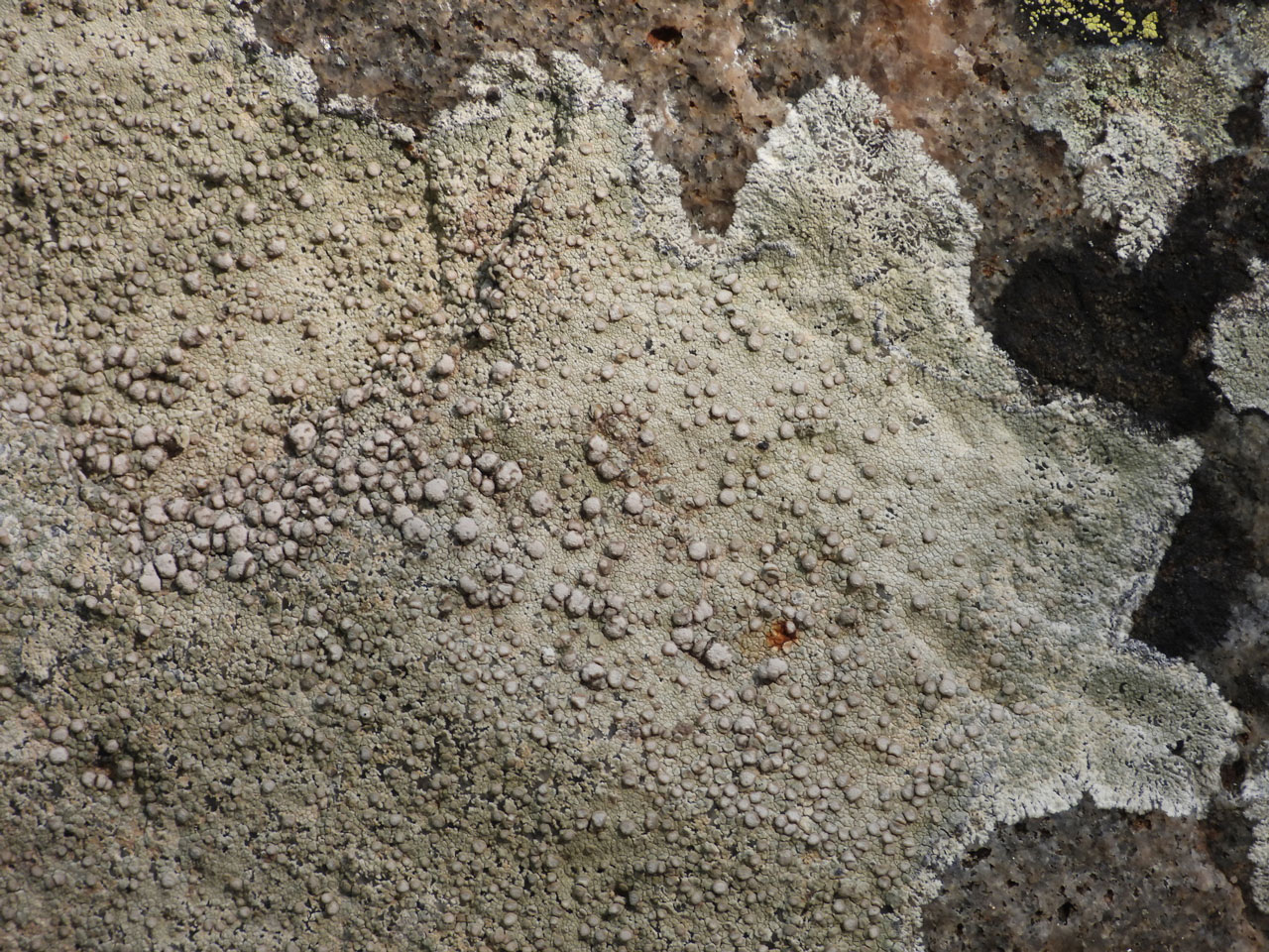 Thallus continuous and finely cracked to areolate, clearly delimited, areoles often uneven in height, ± flat, margins crenulate, white or pale grey or pale yellow to yellowish grey, surface coarsely granular to warted; prothallus white, fibrous, generally well-developed. Apothecia (0.2–) 0.4–1 (–1.7) mm diam., aggregated, immersed to sessile and finally constricted below; thalline margin entire, concolorous with or tending to become paler than the thallus, excluded with age; disc pink- to pale grey-brown, convex to almost subglobose, usually densely white or blue-white pruinose; epithecium brown, granular; hymenium 35–55 µm tall; paraphyses 1.5–2 µm diam., unbranched or sparsely branched especially near the tips, apices to 3.5 µm diam., generally with the terminal cell subglobose. Ascospores (8–) 10–14 × (5–) 6–8 µm. Thallus C–, K+ yellow, Pd+ orange→red, UV– (atranorin, chloratranorin, protocetraric acid).