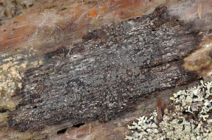 On bark and lignum of old trunks of Pine, Birch and Juniper, especially in old oak-birch or pine-birch woodlands, rare on Oak lignum in England and Wales in pasture woodland and parklands.