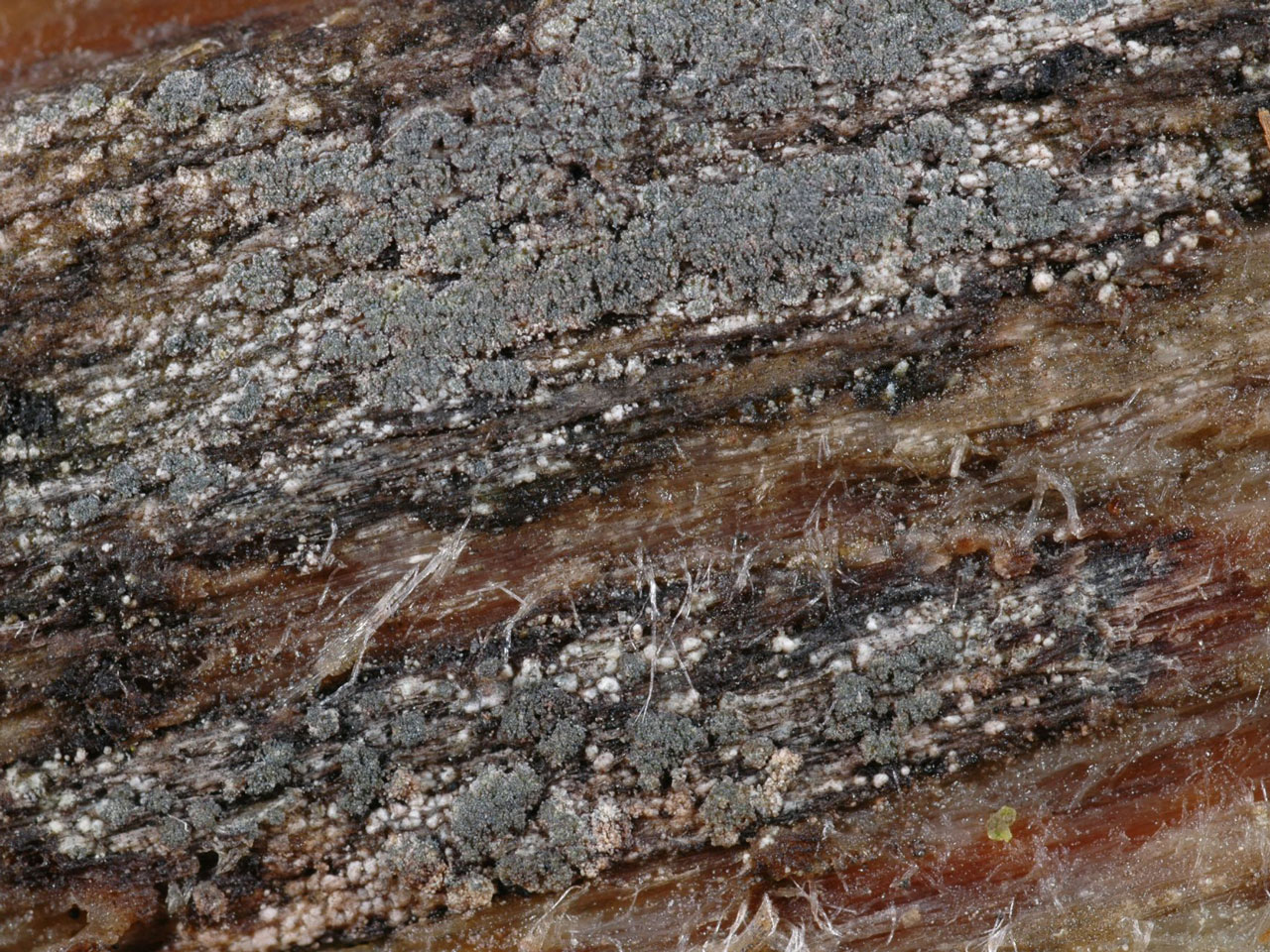 A lichen of acid bark and lignum, mainly found in old woodlands in the east, especially in the Scottish Highlands. It is easily to overlooked; a sorediate crust with grey-white thallus that is often mostly obscured by confluent bluish-grey soralia but the bluish-black prothallus is often distinct. Spot tests are all negative but the soralia are UV+ pale blueish white, but this can be patchy. Rather similar to the oceanic Mycoblastus caesius, but this can be separated by its easy to see and very bright white UV fluorescence.