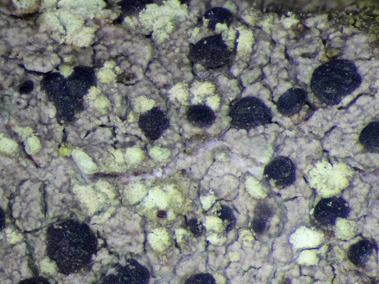 This is similar to Lecidella elaeochroma f. elaeochroma but has bright yellow-green soralia, 0·5–1 mm diam., punctiform and discrete, scattered all over or restricted to only part of the thallus. Apothecia are always present and the production of soralia does not inhibit their formation. The soralia possess lichexanthone and are UV+ yellow.