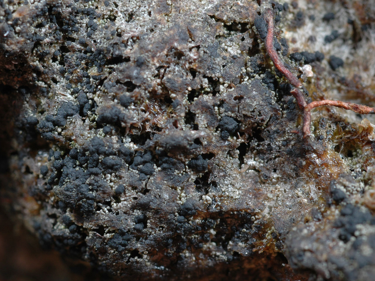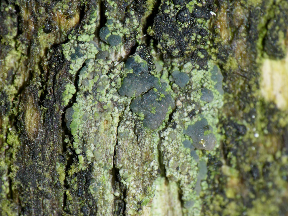 Thallus greenish white or grey-white to blue-grey, of shallowly convex to subglobose areoles 40–200 µm diam; thallus occasionally poorly developed and ± immersed; photobiont cells 4–7 µm diam. Apothecia 0.14–0.4 (–0.6) mm diam., to 1 mm diam. if tuberculate, appressed, flat to convex, whitish (in shade) or blue-grey to black; true exciple well-developed, colourless; hymenium 40–55 µm tall, usually greenish to blue-green (K-, N± red) in the upper part; hypothecium ± colourless; paraphyses 1–1.5 µm diam., numerous, branched especially above; apices often thickened to ca 2.5 µm diam. by green pigment. Asci 40–55 × 12–17 µm, clavate, without ring-structure. Ascospores (11–) 15–23 (–24) × 3–5 (–6) µm, fusiform or cylindrical, ± curved, (1-)3(-5)- septate. Pycnidia frequent (especially on bark or wood): (a) 0.14–0.2 mm diam., immersed, white or greenish around often gaping ostioles, the macroconidia 21–40 (–50) × 1–1.5 µm, curved or sigmoid, often faintly 1- to 5-septate; (b) 50–80 µm diam., ± sessile, whitish, the microconidia 6–7 × 0.5–1 µm, fusiform–cylindrical. Thallus, apothecia and pycnidia C± red, K–, Pd– (gyrophoric acid).