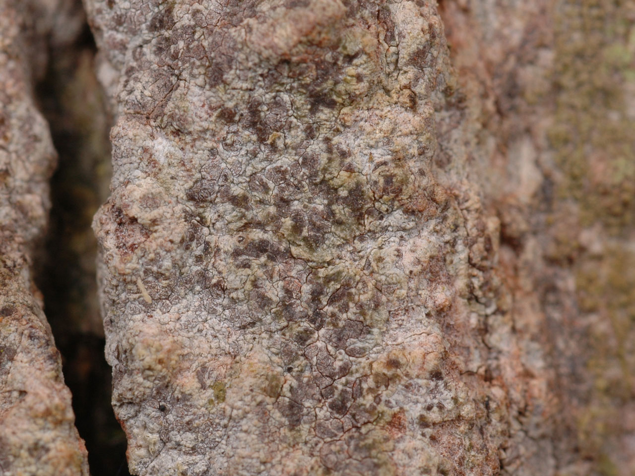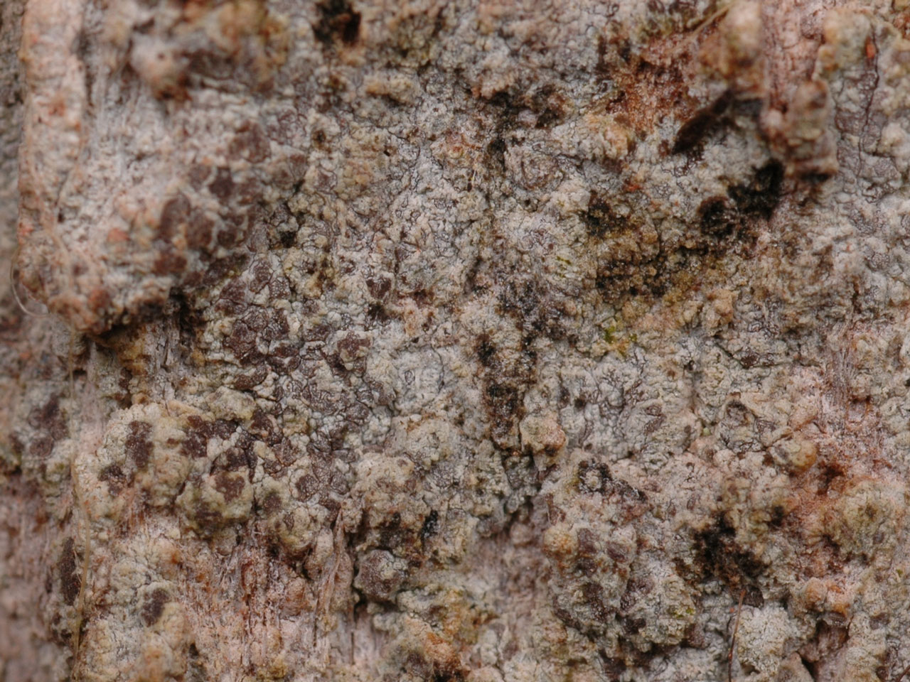 Thallus effuse and often wide-spreading, white to pale grey or pale brown, matt or powdery, rimose-cracked and 0.1–0.3 mm thick but sometimes warty and to 1 mm thick. Apothecia to 1 mm diam., rounded or angular, sometimes elongate or substellate, immersed, pink to dark brown but usually thickly white-pruinose and hence inconspicuous when dry; in section 100–250 (–250) μm tall; epithecium red-brown, K+ grey or pale green; hymenium 40–60 μm tall, colourless; hypothecium 45–85 (–170) μm tall, colourless; paraphysoids numerous, 1–1.8 μm diam., in the epithecium often with brown walls and to 2.5 μm diam. Ascospores 13–22 × 4.5–7 μm, (3–) 4–5-septate, cylindric-obovoid, the apical cell not enlarged, colourless, old ascospores apparently never brown. Pycnidia 100–200 μm diam., rare, ± immersed, pale or red-brown, internally convoluted, the wall colourless or pale red-brown (K+ pale green); conidia 10–16 × 0.5 μm, short thread-like, usually curved. Thallus and apothecia pruina C+ red, K–, Pd–, UV– (arthoniaic acid).
