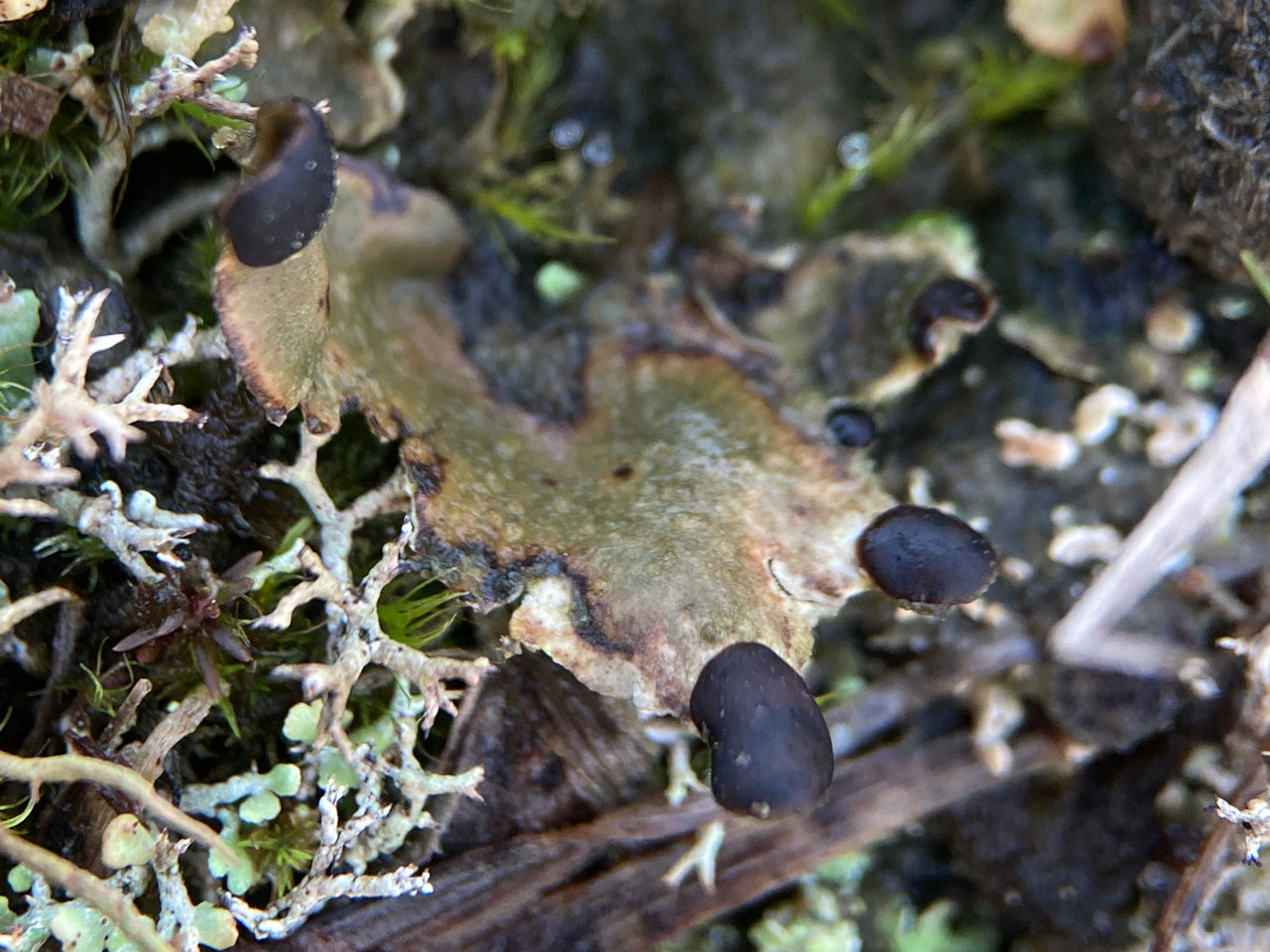 This Dogtooth is a local colonist of somewhat base enriched disturbed ground. Similar to Peltigera hymenina, with the upper surface not tomentose, but differs in being thinly white-grey-pruinose at least at the edges and often cracked, along with diffuse dark veins on the lower surface. When fertile the apothecia are a distinctive dark brown-black, becoming bean-shaped.