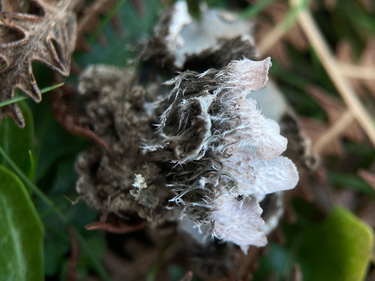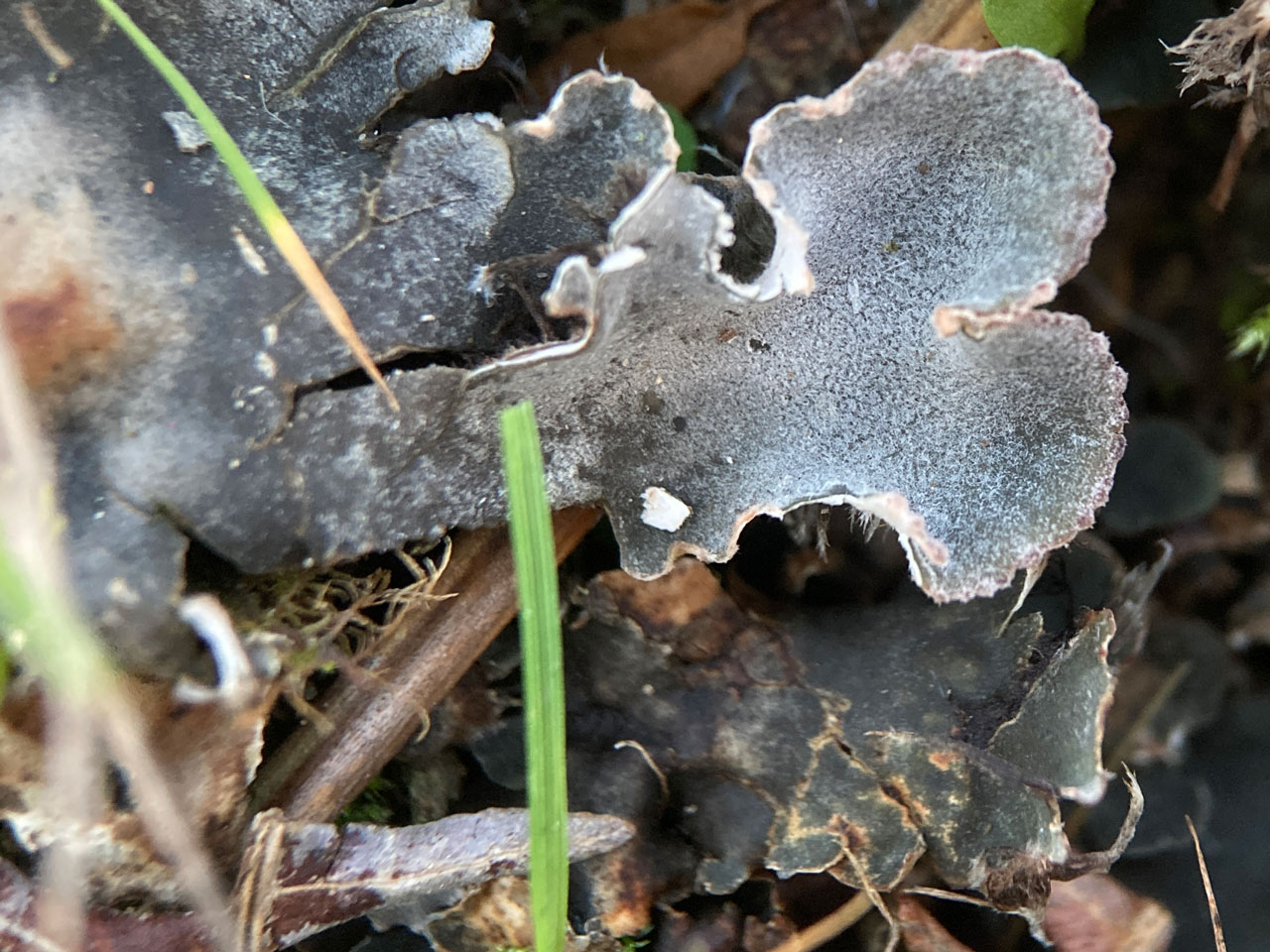 This widespread Dogtooth, the Frosted Dogtooth, forms conspicuous patches, often fertile, on base enriched dry soils, often in disturbed habitats. The upper surface is thickly tomentose, at least at the edges, but it can be separated from the Peltigera membranacea group by the narrower lobes, which do not exceed 1cm wide, with upturned margins. The underside darkens to the centre and has dark branched ± fasciculate rhizines.
