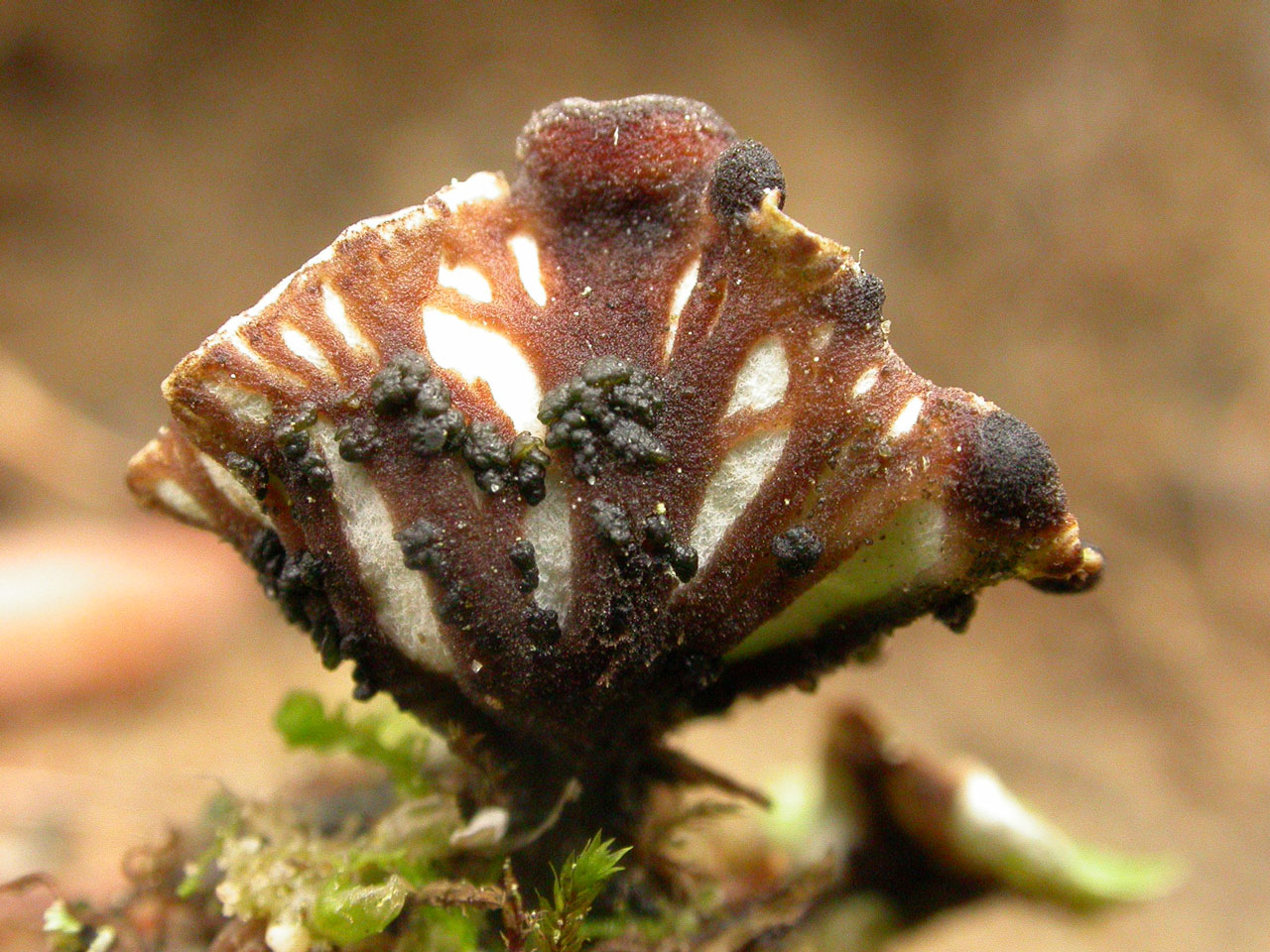Thallus to 2 cm diam., of a single, rounded or mussel-shaped lobe or of several, discrete or overlapping fan-shaped lobes; lobes 0.5–2 cm broad, often thicker than 1 mm; margin entire or indented, rather regular; upper surface bright green when wet, photobiont green (Coccomyxa), grey-green when dry (becoming pale to dark brown in dried collections), smooth, ± shiny; lower surface with conspicuous fan-shaped pale to dark brown radiating veins, without rhizines, tomentose; cephalodia (with Nostoc) scattered, associated with veins, superficial, dark brown or grey, rounded or irregular and wart-like. Apothecia usually present, 1–6 per lobe, marginal, oval, wider than long, black-brown, horizontal, flattened. Ascospores 30–47 × (4–) 7–8 µm. Thallus with tenuiorin, methyl gyrophorate, ± gyrophoric acid (C± red), phlebic acids A and B, T1 and up to four unidentified terpenoids. The blue-green morphotype lacks lichen substances.
