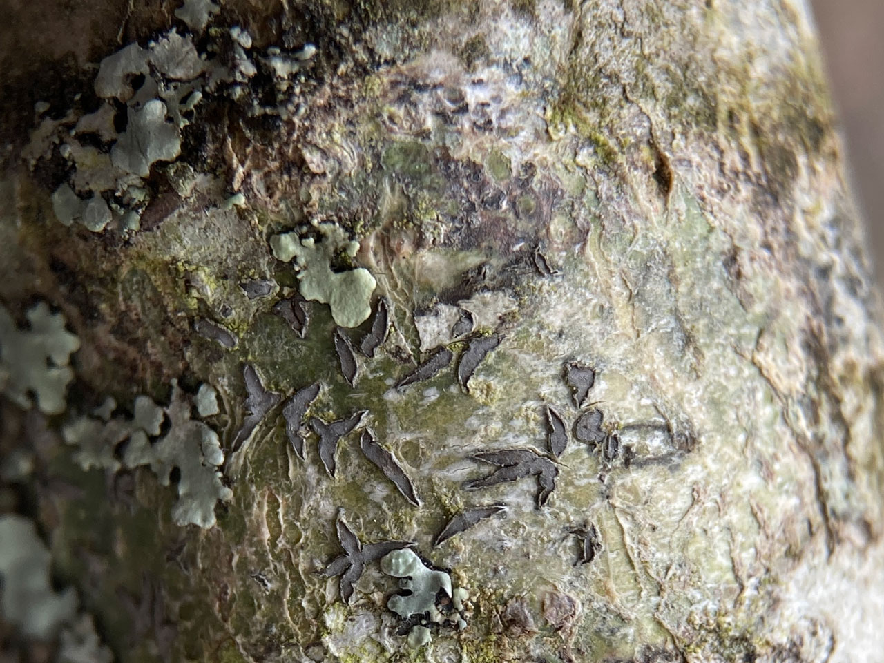On ± shaded, smooth bark of deciduous trees, especially saplings and young trees, in humid situations in old woods, rare on wayside trees.
