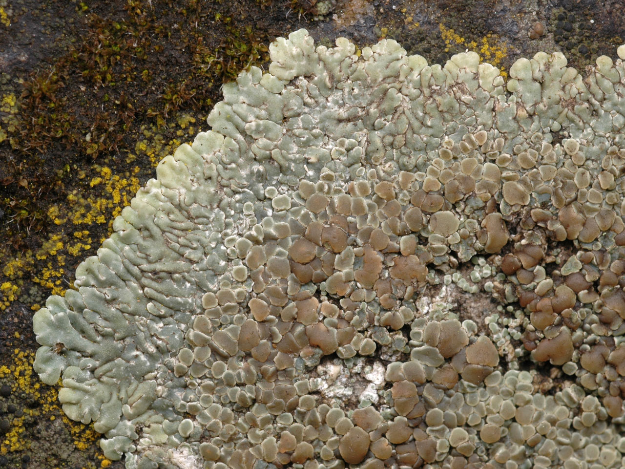 Thallus to 10 cm diam., forming placodioid circular patches or rosettes, usually closely appressed but becoming uneven when old; marginal lobes 0.5–0.8 mm broad, flat to concave, corticate below, thallus centre sometimes areolate, in extreme habitats reduced to dispersed granules or areoles, pale green-yellow to yellow-brown, tending to be darker centrally, ± shiny to slightly pruinose, the undersurface and edges of the marginal lobes pale grey. Apothecia 0.5–1.5 (–2) mm diam., sessile, densely aggregated in the centre of the thallus; thalline margin well-developed, entire to crenulate or flexuose, often angular by compression, pruinose, generally persistent, sometimes almost excluded in old apothecia; disc yellow-brown to red-brown, flat to slightly convex, not pruinose; epithecium pale yellow to brown, with granular crystals on the surface that do not dissolve in K; hymenium (50–) 65–75 (–80) µm tall; paraphyses 2–3 µm diam., mainly unbranched or sparsely branched above, apices not swollen or capitate. Asci 30–40 × 8–12 µm. Ascospores 9–15 (–16) × (4–) 5–7 µm. Conidia 20–25 × 0.75–1 µm, thread-like to curved. Thallus C–, K–, KC+ pale yellow, Pd± yellow, UV+ dull orange (usnic acid, zeorin, ± murolic acid, ± psoromic acid).