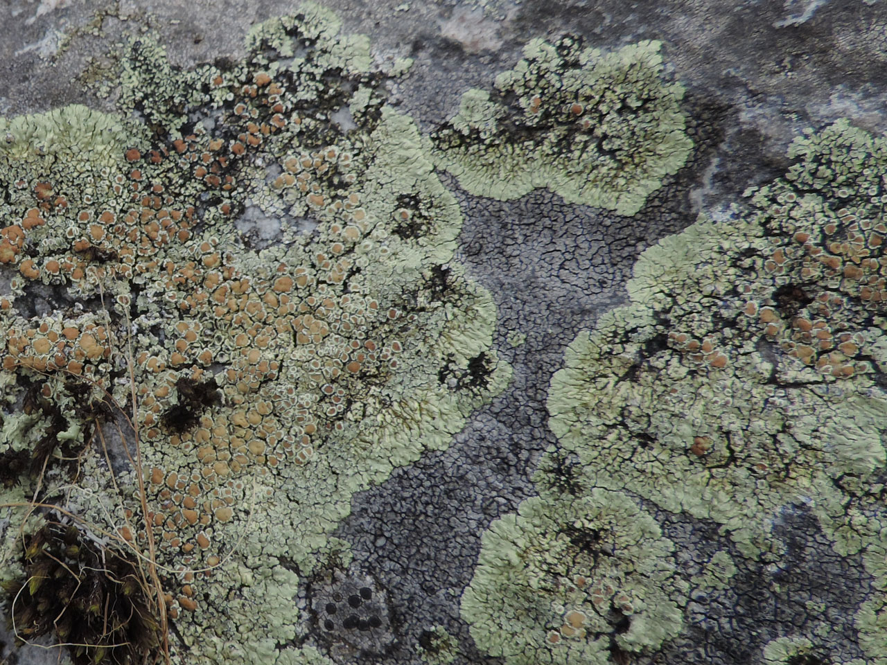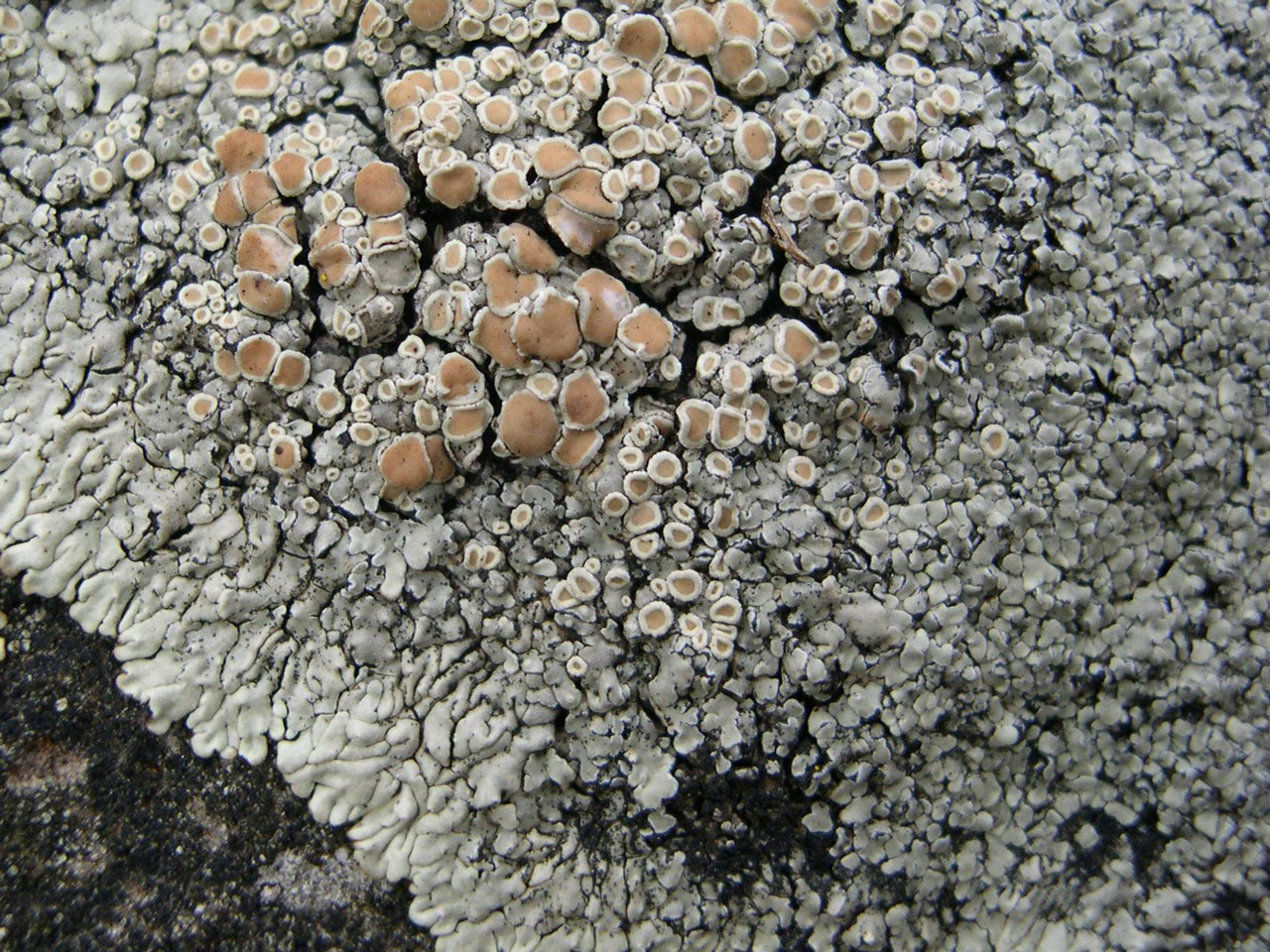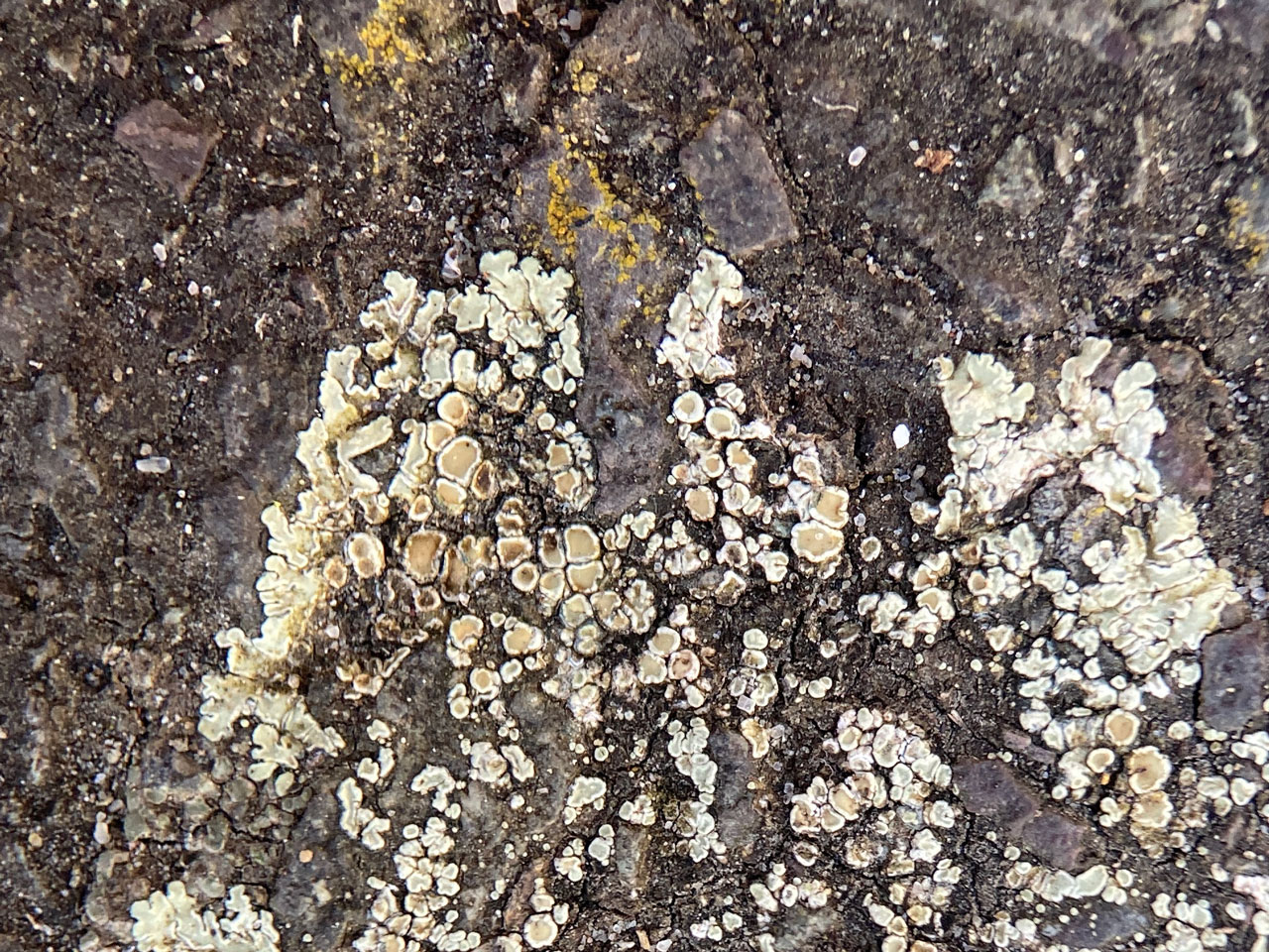 A distinctive lichen with a wide range of occurrence. It is found as large spreading thalli on bird perching rocks by isolated upland tarns and lochans through to trampled scraps on urban pavements resembling dropped chewing-gum. It forms placodioid circular patches and is unlikely to be confused with any other widespread British species. Similar species are the northern, exclusively coastal, Myriolecis straminea which has a C+ orange thallus or the very similar Protoparmeliopsis achariana which has more loosely attached and ± convex lobes. The latter is a very rare species but occurs with P. muralis on rocks by upland tarns.