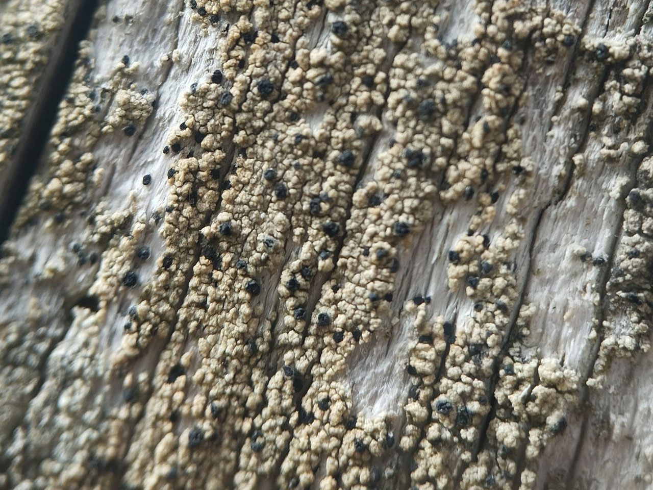 First discovered in 2010 in south east Scotland, with a second record from south east England in 2014. Mainly a species of old weathered and untreated work timber, both here and northern Europe, but also on natural conifer snags (standing dead trees) in open or even exposed stands in central Europe. Threatened elsewhere in Europe, as in Sweden, due to the decline in the use of untreated timber for fencing etc. and probably also so threatened here. Distinctive in the areolate thallus which is C+ red and Pd+ yellow, combined with flat, black apothecia with a persistent raised exciple and the habitat. Separated from the very similar boreal Pycnora xanthococca by conidial characteristics.