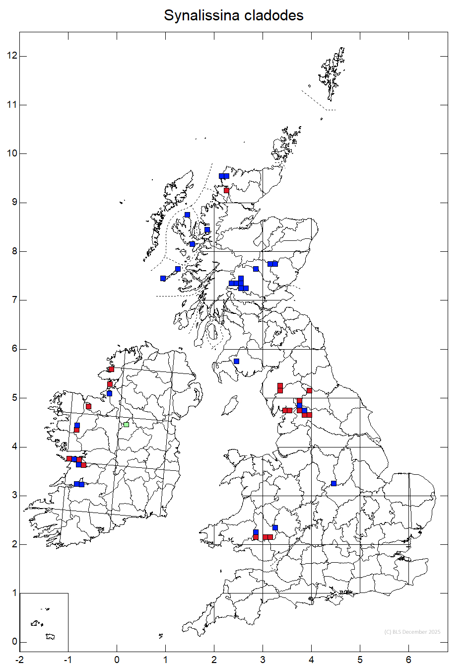 Taxon Synalissina cladodes Authority (Tuck.) M. Schultz & M. Prieto (2024) Synonyms Lempholemma cladodes Conservation Status NT NR Sc (Key) BLS Number 814 Distribution Map