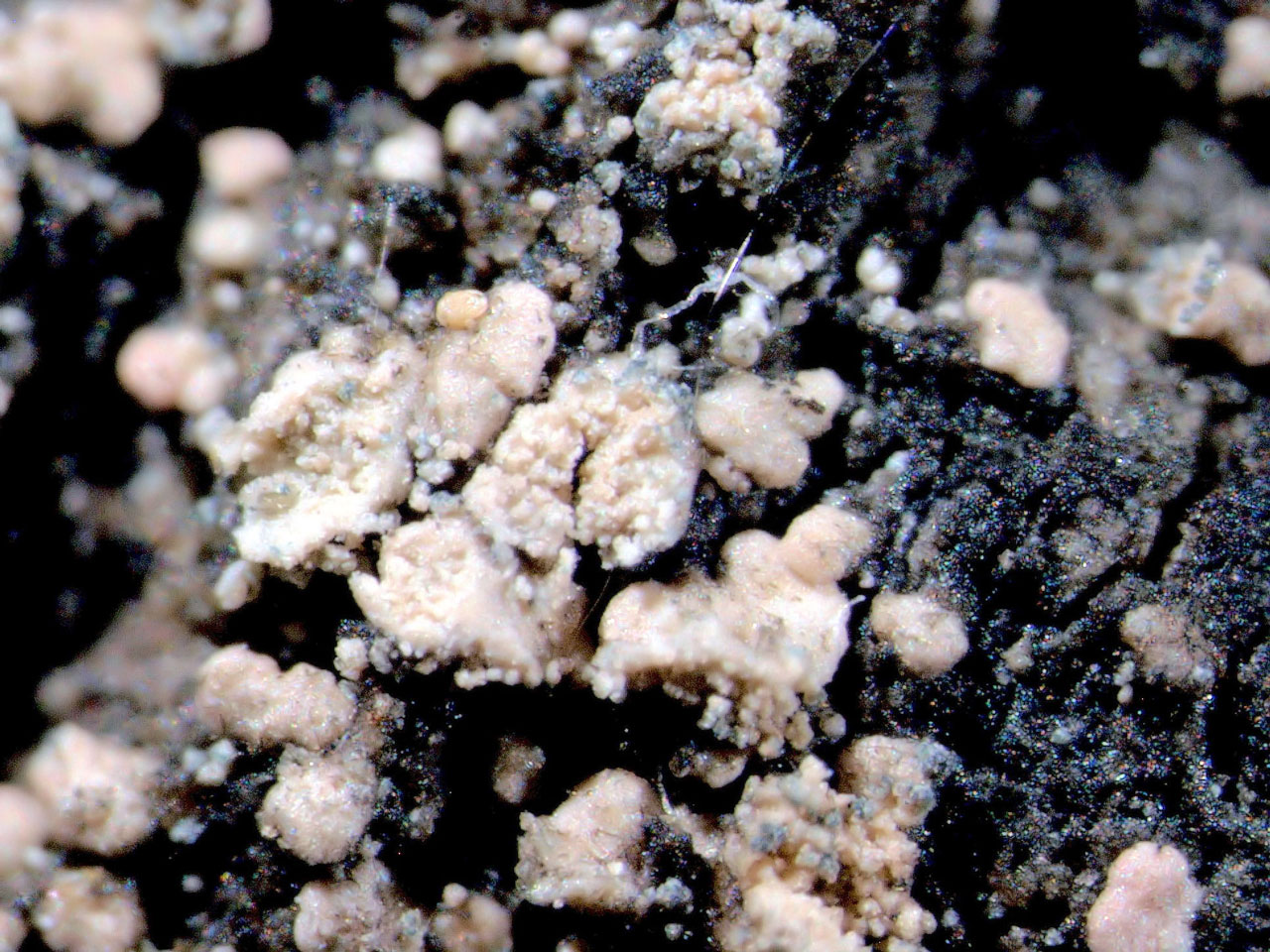Thallus crustose to subsquamulose, episubstratal, usually indeterminate, thick, forming small patches between other lichens or, more rarely, spreading irregularly up to 10 mm or more across, areolate, sorediate; prothallus usually as an indistinct pale greyish brown stain or, more rarely, distinctly brown, blue or blackish; areoles usually persistently discrete, rarely becoming contiguous or, very rarely, more or less imbricate, almost circular to irregular, often distinctly incised and constricted at the base (subsquamiform), occasionally tending to become raised at the edge, flat to convex, conspicuous, to 0.4 (–1.0) mm across, non-sorediate surface usually distinct, smooth, dull, greyish white, pale yellowish green or pale yellowish brown; in dried collections often becoming more distinctly yellowish brown or pink; soralia pale green to pale yellowish with a brown tinge (usually becoming distinctly yellowish brown in dried collections), occasionally distinctly aeruginose due to a pigment (fading in K, N+ brown) in the external soredia, usually marginal and ± labriform, sometimes laminal and more or less orbicular, or apical and more or less capitate, usually delimited; soredia mostly fine, 20–45 µm diam.; wall distinct; medulla distinct, white. Apothecia and pycnidia not known. Thallus and soralia C+ red, K+ yellow, KC+ red, P+ yellow, UV+ yellow (alectorialic acid).