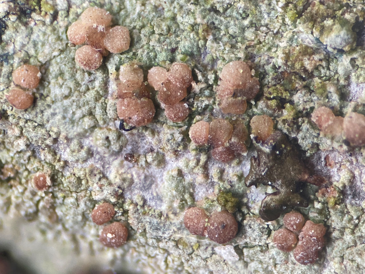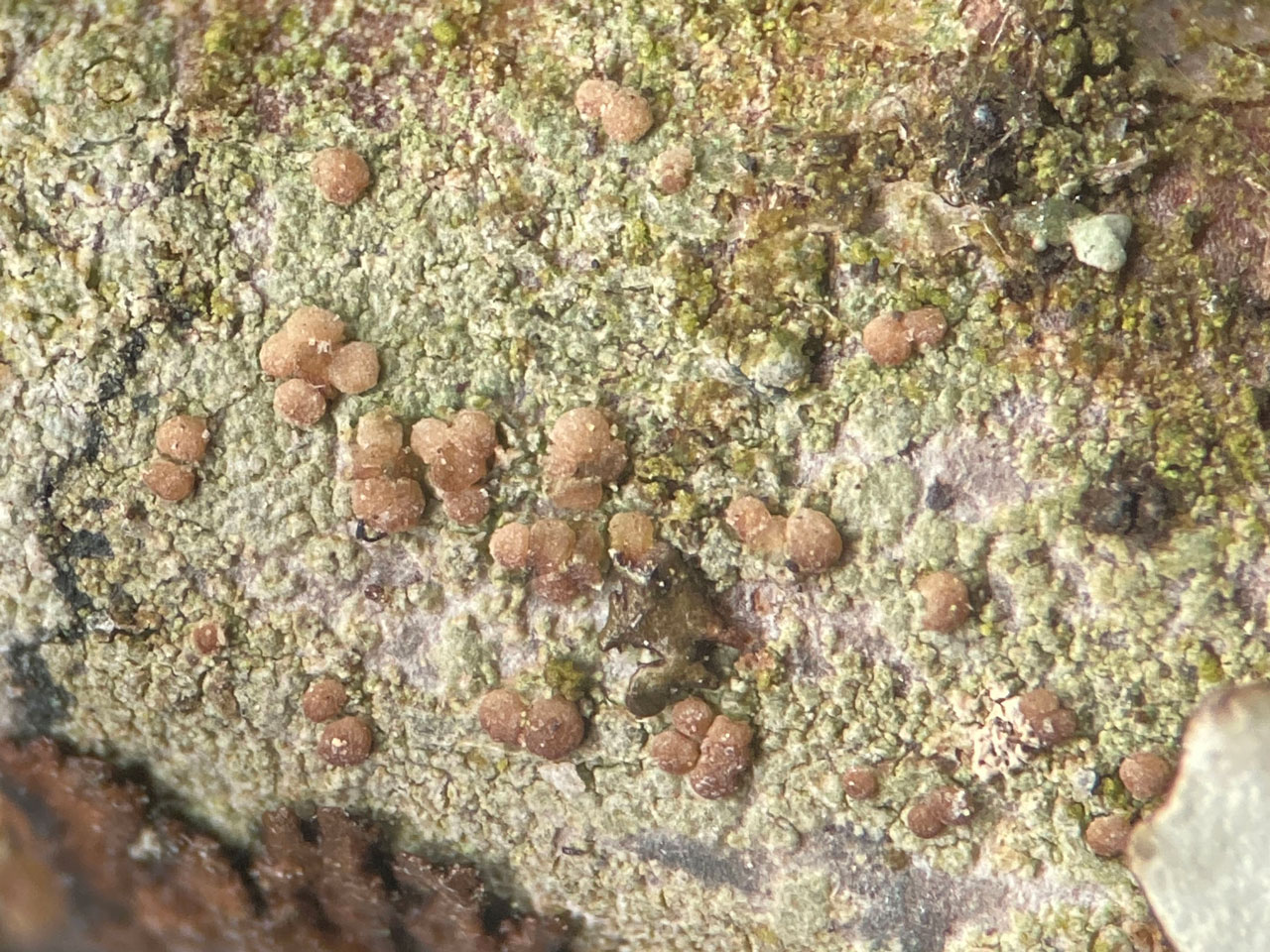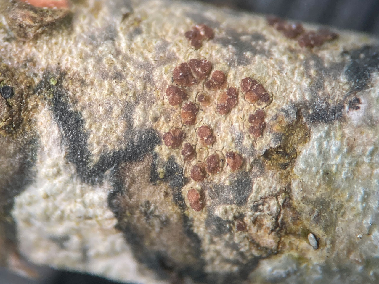 Now called Xanthosyne varians subsp. exigua. A small easily overlooked lichen found on twigs in humid valley woodlands, parklands & pasture woodlands. Long only known from the lower Tamar valley in South Devon and East Cornwall but its discovery further west in East Cornwall in 2022 and much further to the east in South Hampshire in 2026, suggests it may be spreading and it should be looked out for elsewhere. Superficially similar to Japewiella tavaresiana but distinguished by the clustered apothecia, which sometimes merge and fuse with adjoining apothecia, smaller spores and K/UV(wet)+ bright yellow-green, KC+ orange and UV± pinkish orange thallus. More likely to be overlooked as poorly grown or damaged Lecidella elaeochroma f. elaeochroma with pale apothecia, but this has larger apothecia and spores and is UV+ very bright orange.