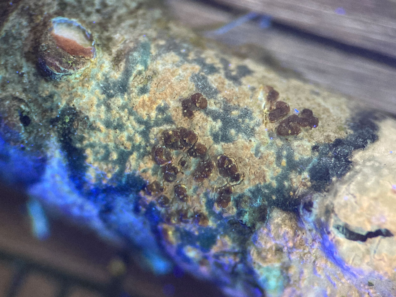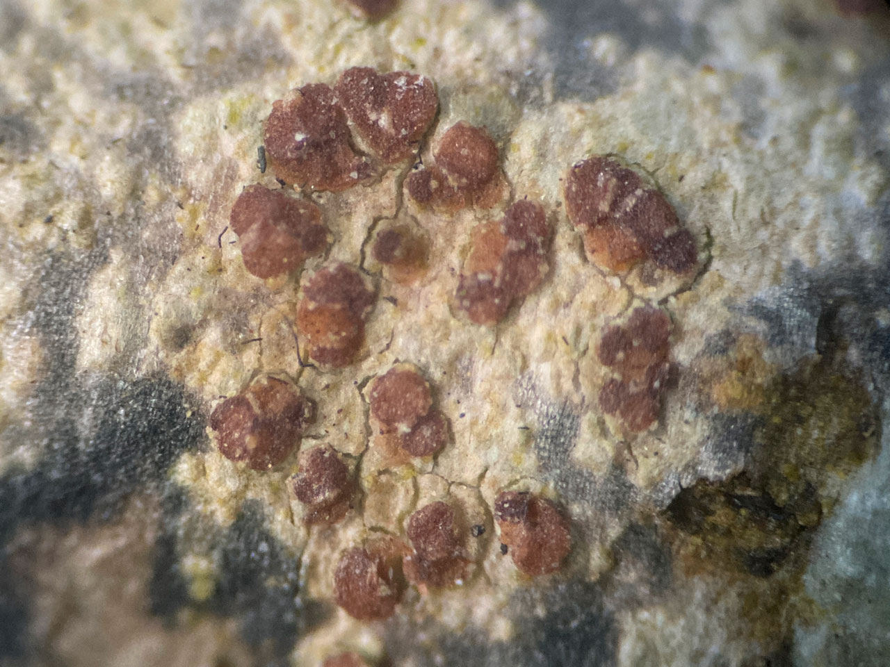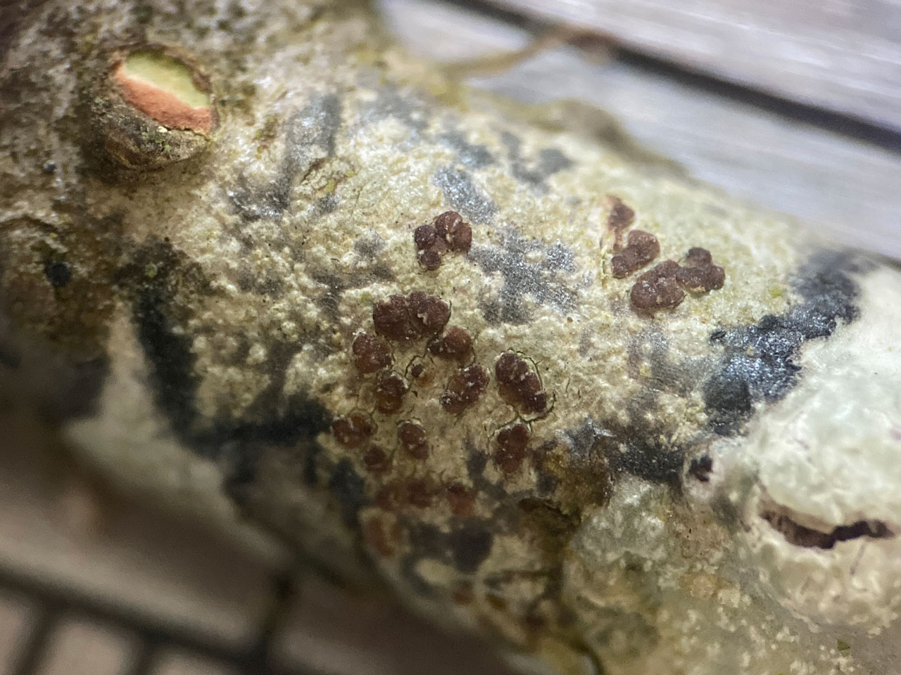 Now called Xanthosyne varians subsp. exigua. A small easily overlooked lichen found on twigs in humid valley woodlands, parklands & pasture woodlands. Long only known from the lower Tamar valley in South Devon and East Cornwall but its discovery further west in East Cornwall in 2022 and much further to the east in South Hampshire in 2026, suggests it may be spreading and it should be looked out for elsewhere. Superficially similar to Japewiella tavaresiana but distinguished by the clustered apothecia, which sometimes merge and fuse with adjoining apothecia, smaller spores and K/UV(wet)+ bright yellow-green, KC+ orange and UV± pinkish orange thallus. More likely to be overlooked as poorly grown or damaged Lecidella elaeochroma f. elaeochroma with pale apothecia, but this has larger apothecia and spores and is UV+ very bright orange.