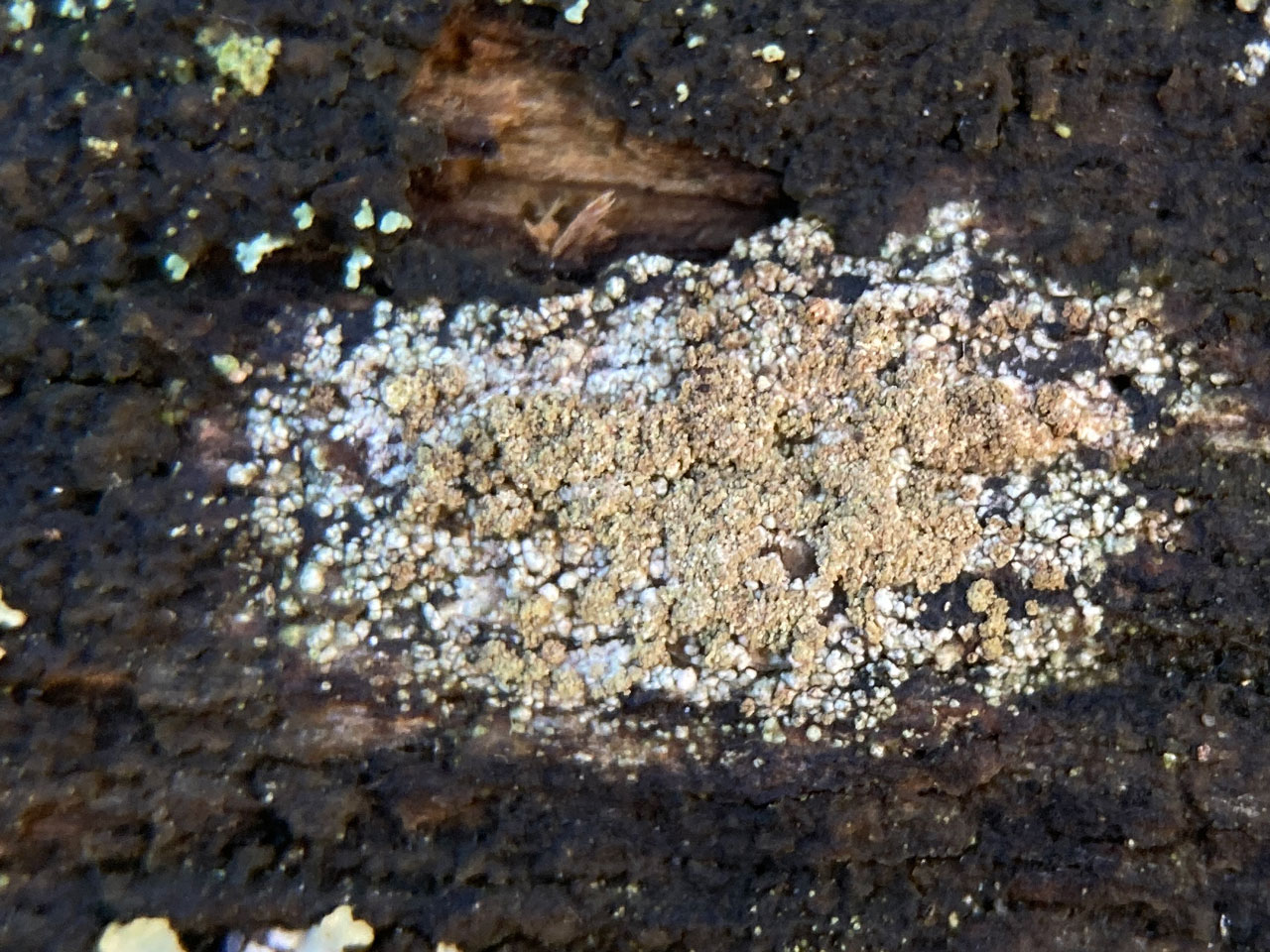 A frequent, rather scruffy sorediate crust, found on acid bark and wood in both clean air areas and in polluted areas. With a pale slate or dark grey thallus of low warts which often erode and become sorediate The soredia pale yellowish green to deep blue-grey, often forming a ± continuous thick patchy granular-sorediate crust. Can be mistaken for several similar lichens, but these lack the combination of a Pd+ rust-red and K± brownish spot tests.