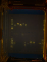 An agarose gel electrophoresis plate, which demonstrated we were getting successful results (click on the image to see a larger one)